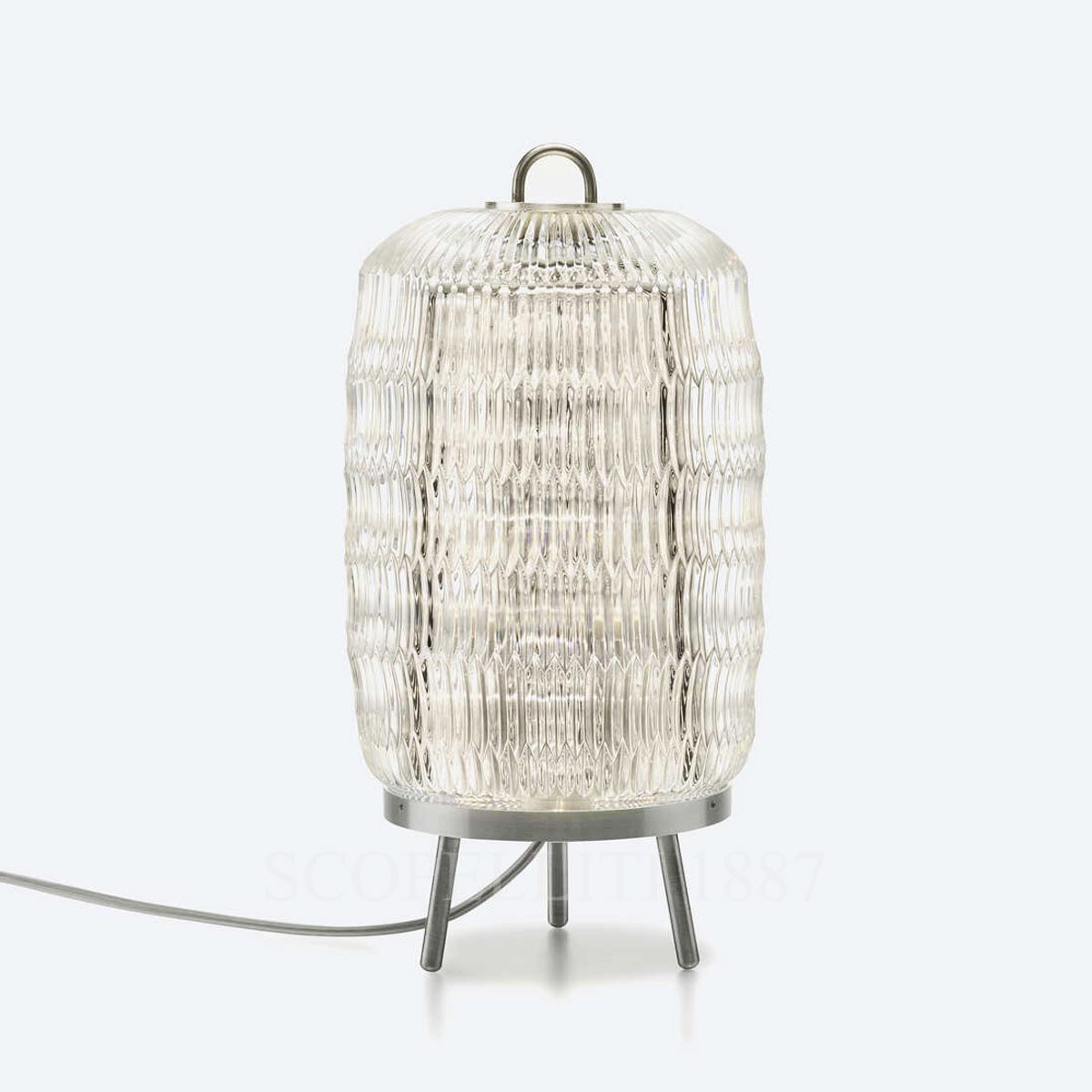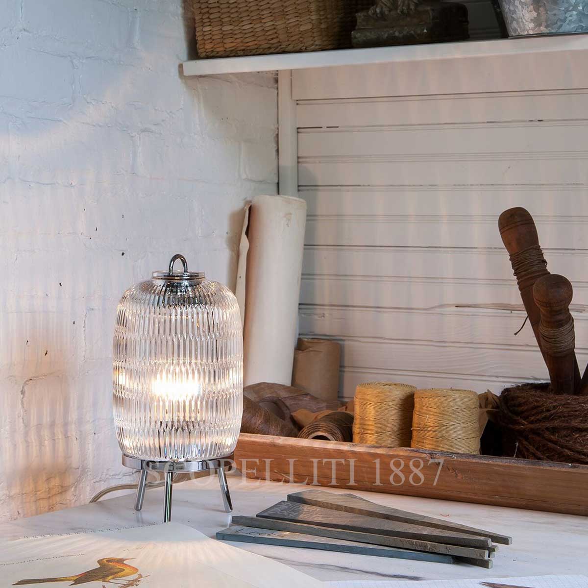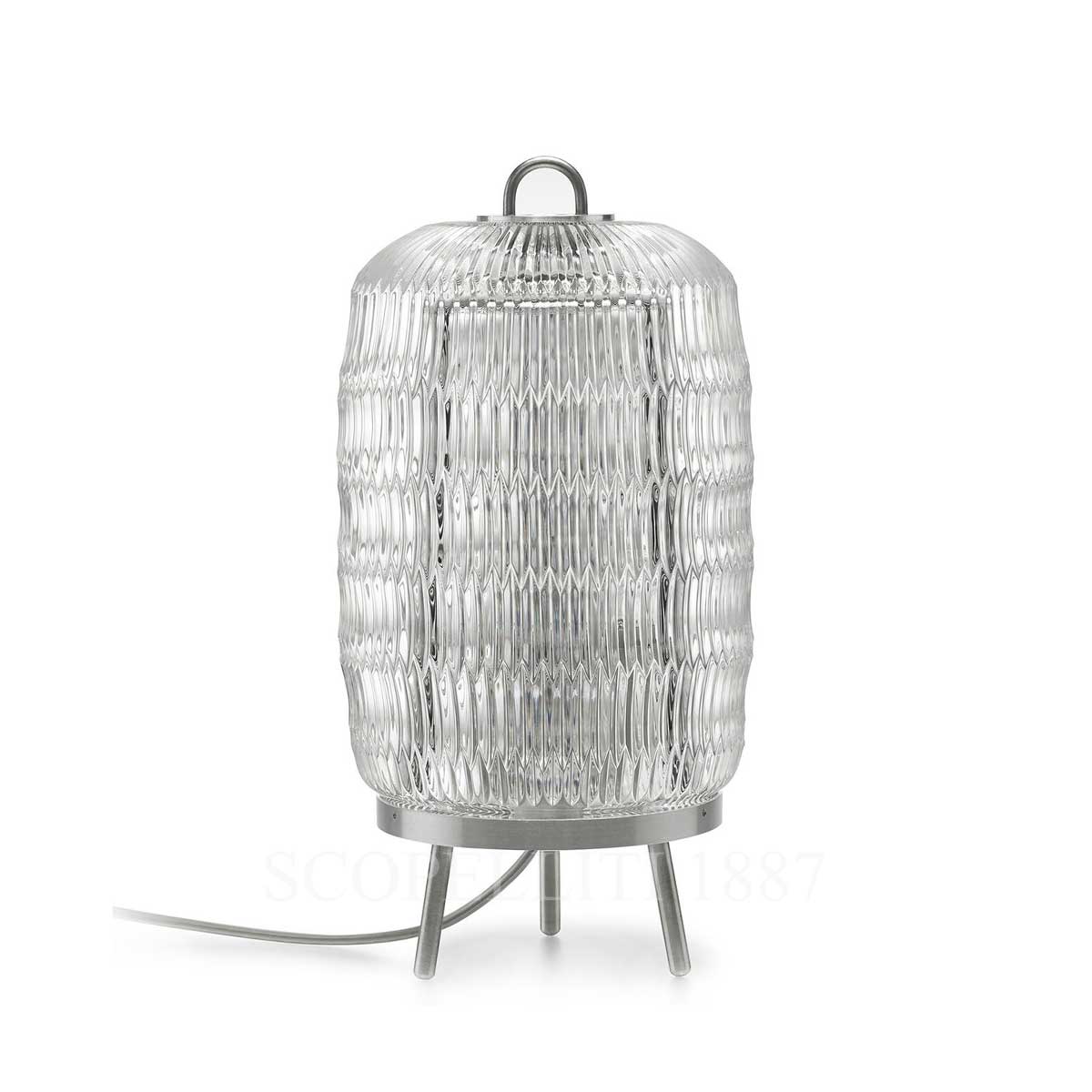 The Baccarat Celeste Table Lamp, designed by Philippe Nigro, magnifies the light through a new elongated bevel cut. The lamp stands on three detachable feet in mirror-finish metal.
