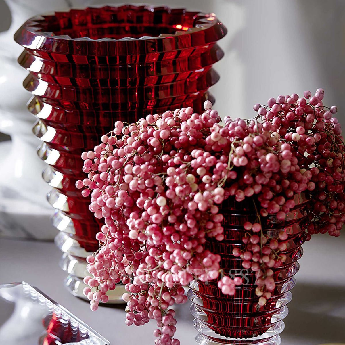 The Baccarat Eye Oval Vase Small Red is a striking piece of crystal artistry that blends vibrant color with exceptional craftsmanship. Its rich red hue, combined with Baccarat’s signature bevel cuts, creates a stunning interplay of light that adds depth and sophistication to any space.