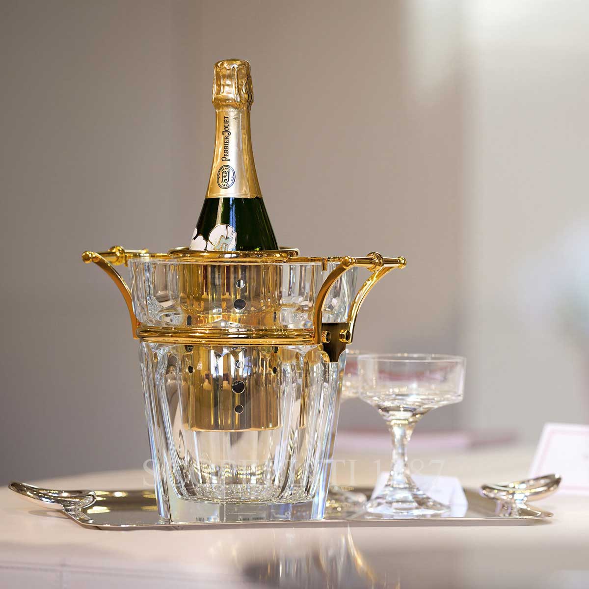 The Baccarat Harcourt Champagne Cooler Clear Gold is a symbol of elegance, crafted from the finest crystal with gold accents that elevate any occasion. It is designed to keep your champagne perfectly chilled while showcasing its luxurious quality.