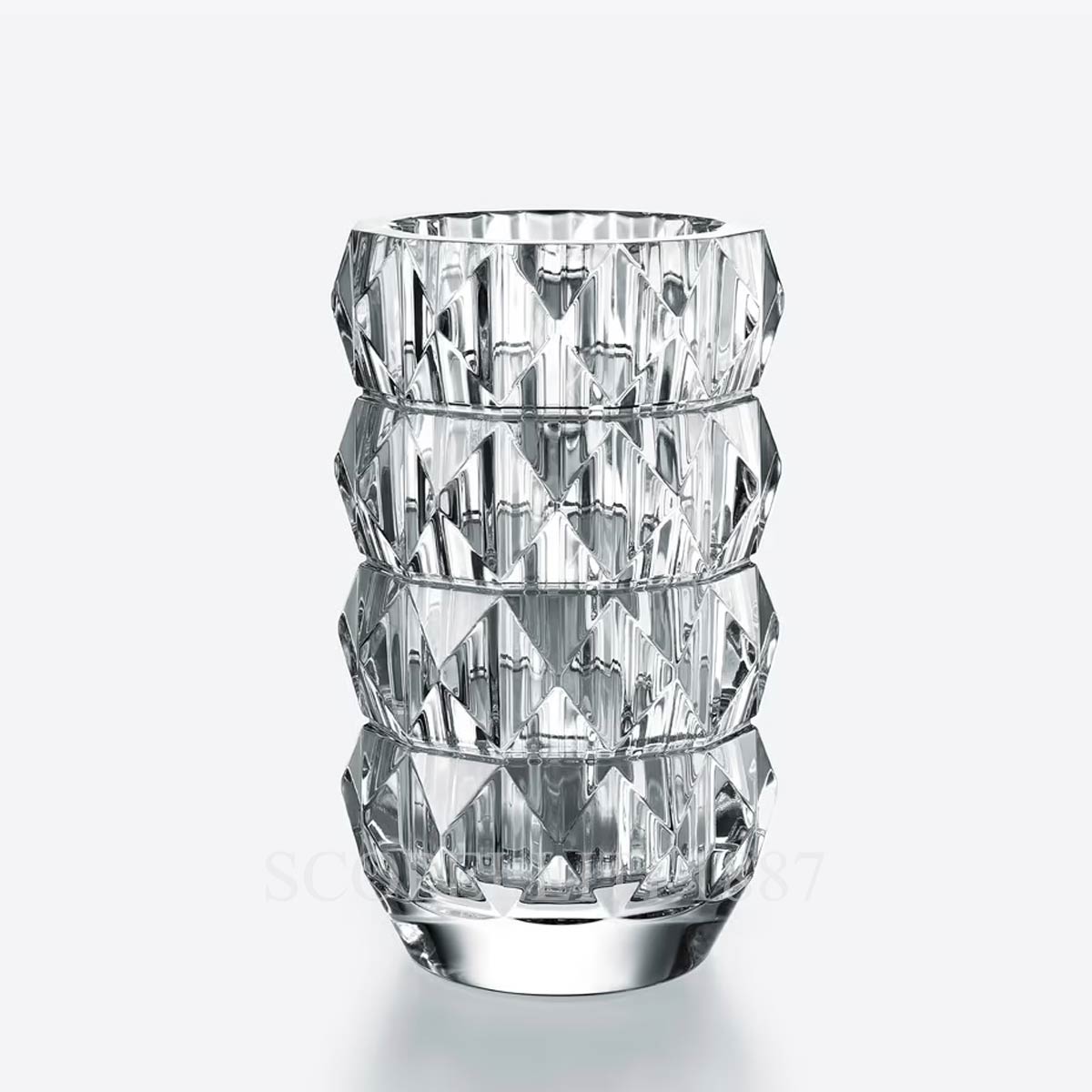 This Baccarat Louxor Vase round medium size with a height of 23 cm, is crafted in exquisite clear cut crystal, featuring a polished surface with a diamond cut design and a vertical inner cut that enhances its luminous beauty. The Baccarat Louxor Vase round medium in celar crystal, designed by Thomas Bastide, draws inspiration from the Art Deco era with its lavish cut crystal surface. The vase interacts with light, scattering reflections and creating an almost hypnotic, optical effect that scintillates and radiates brilliance. The precise geometric diamond cuts and vertical gadroon motif inside exemplify Baccarat’s exceptional craftsmanship, offering a three-dimensional surface that creates the mesmerizing illusion of infinite pyramids of light. With its diamond and bevel cuts, combined with vertical lines inspired by Ancient Egyptian architecture, the Baccarat Louxor vase elevates any bouquet into an extraordinary work of art.