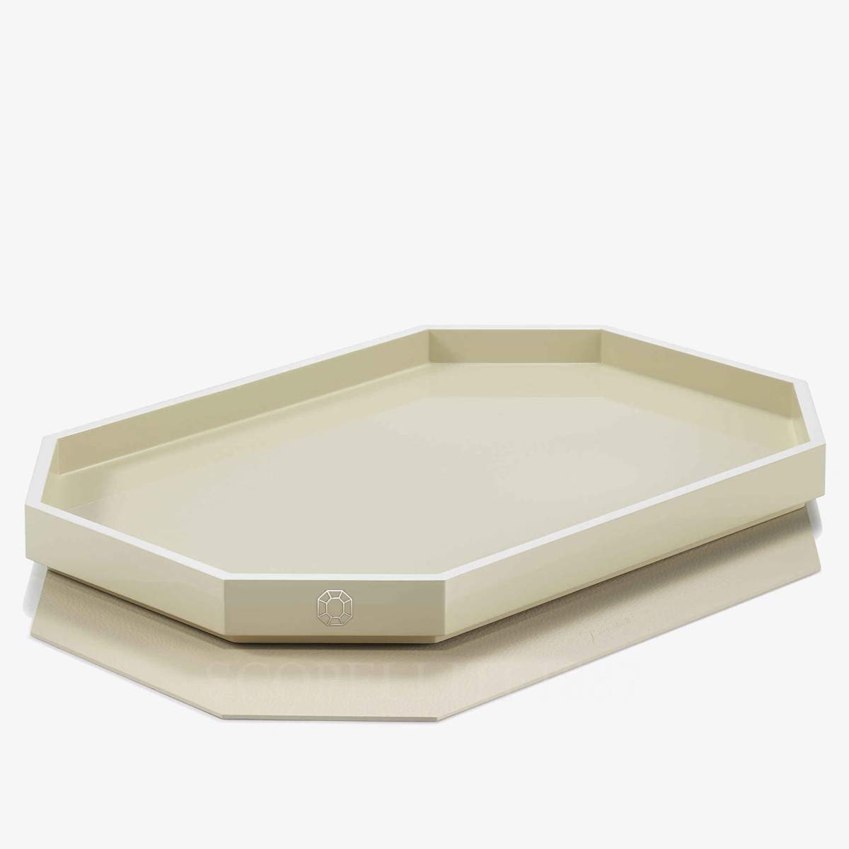 The Baccarat Octogone Tray Ivory Large is a stunning, handcrafted piece available in three sizes. Its design is inspired by Baccarat’s signature red octagonal tassel. This tray is part of a larger collection of elegant lacquered accessories. Shaped like an octagon, it is crafted using traditional techniques, featuring a glossy surface that reflects light beautifully and complements Baccarat’s crystal creations. Each tray includes a removable leather insert, offering a stylish contrast of textures. The tray comes in various colors, updated seasonally, and pairs perfectly with matching coasters from the same collection.