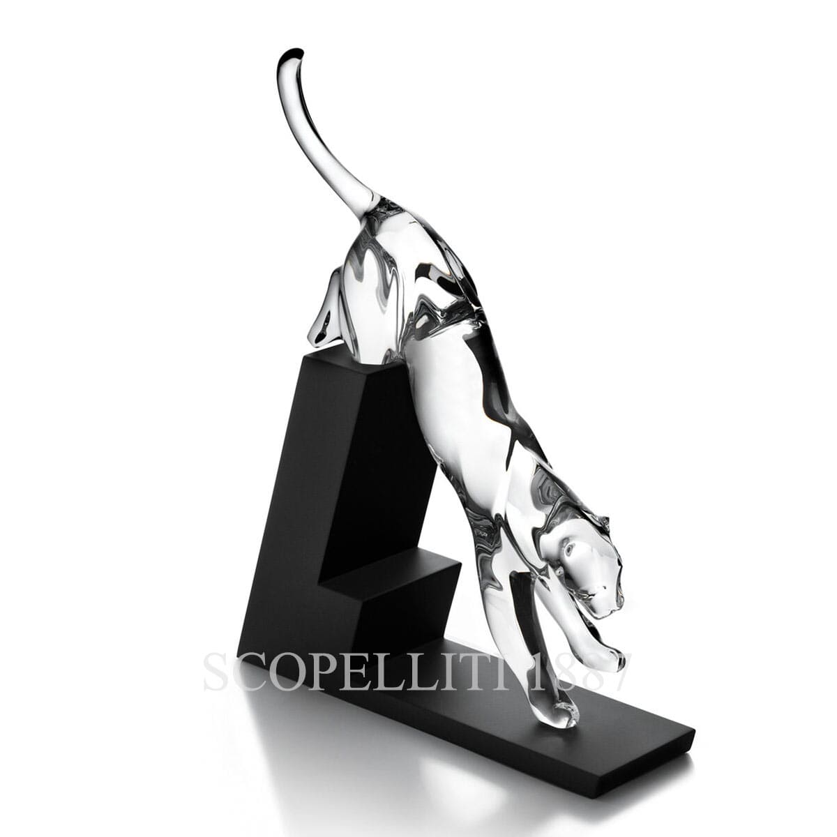 The dynamic pose captures both grace and raw energy in a single moment of suspended motion. Crafted from clear crystal, the sculpture is paired with a matte black resin base, designed to contrast and enhance the crystal’s brilliance.