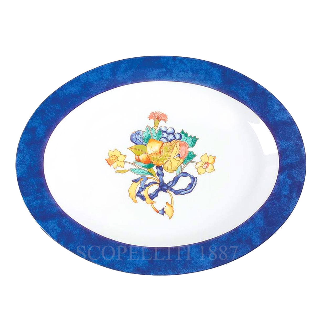 Bernardaud Borghese Oval Platter is designed to perfectly serve your dishes. This beautiful plate with blue rope border and yellow rim is a perfect addition or replacement to any Borghese Collection. Discontinued and extremely difficult to find pattern! The Bernardaud Borghese oval platter is a refined porcelain serving piece inspired by the splendor of Italy’s Borghese palaces and their enchanting gardens. Its décor, full of vitality and freshness, recalls the elegance of Mediterranean landscapes, rich in colors and delicate fragrances that evoke moments of pure relaxation. Measuring 34 cm, this platter is ideal for presenting roasts, fish, or elaborate appetizers with elegance. Its artistic design and timeless charm make it suitable for both formal dining and display, embodying the prestige of Bernardaud Limoges porcelain.