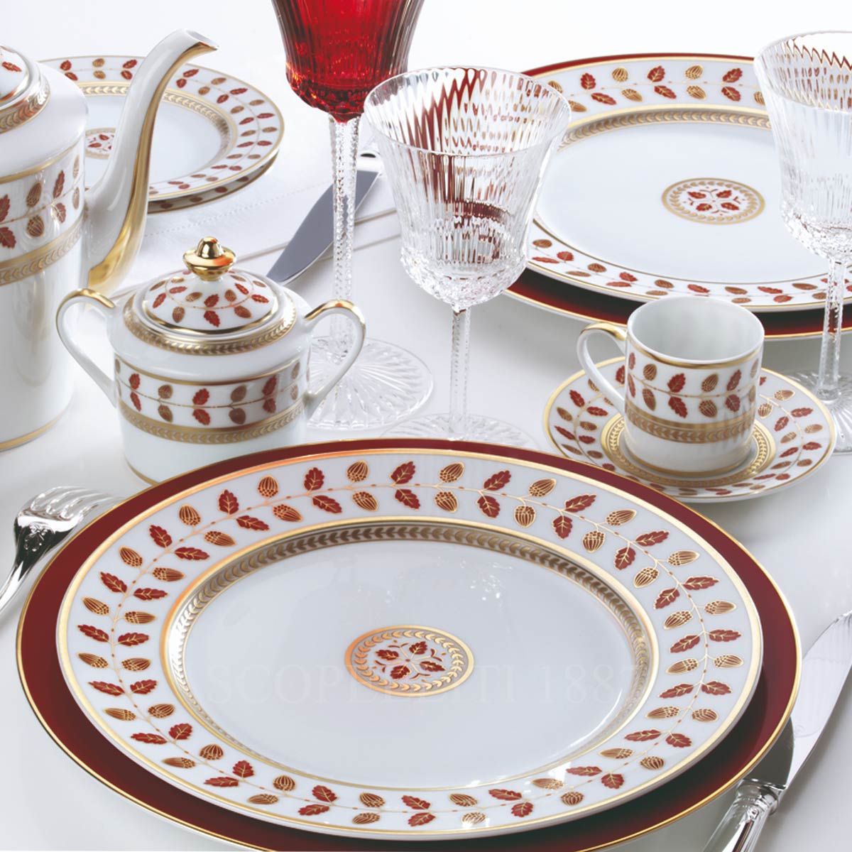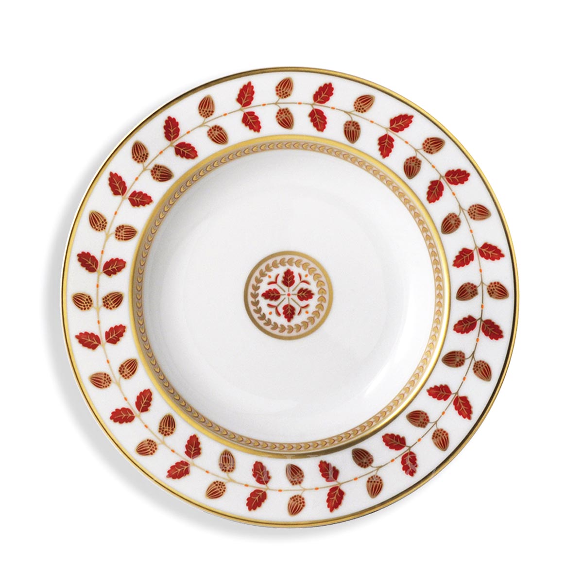 Bernardaud Constance Soup Plate Rouge in porcelain. The Bernardaud Constance Rouge soup plate offers a refined expression of Empire style elegance. Its design features acorns, oak, and laurel leaves — enduring symbols of strength, longevity, and peace — delicately arranged like watercolor brushstrokes. Measuring 22.5 cm, this plate is intended for a more formal use than a coupe soup and is ideal for serving broths, soups, or appetizers. The Rouge variation enriches the classic Constance décor with deep red accents, adding a warm and regal touch to the table. Crafted in Bernardaud Limoges porcelain, the Constance Rouge soup plate combines tradition, artistry, and timeless sophistication, making it suitable for both everyday refinement and grand occasions.