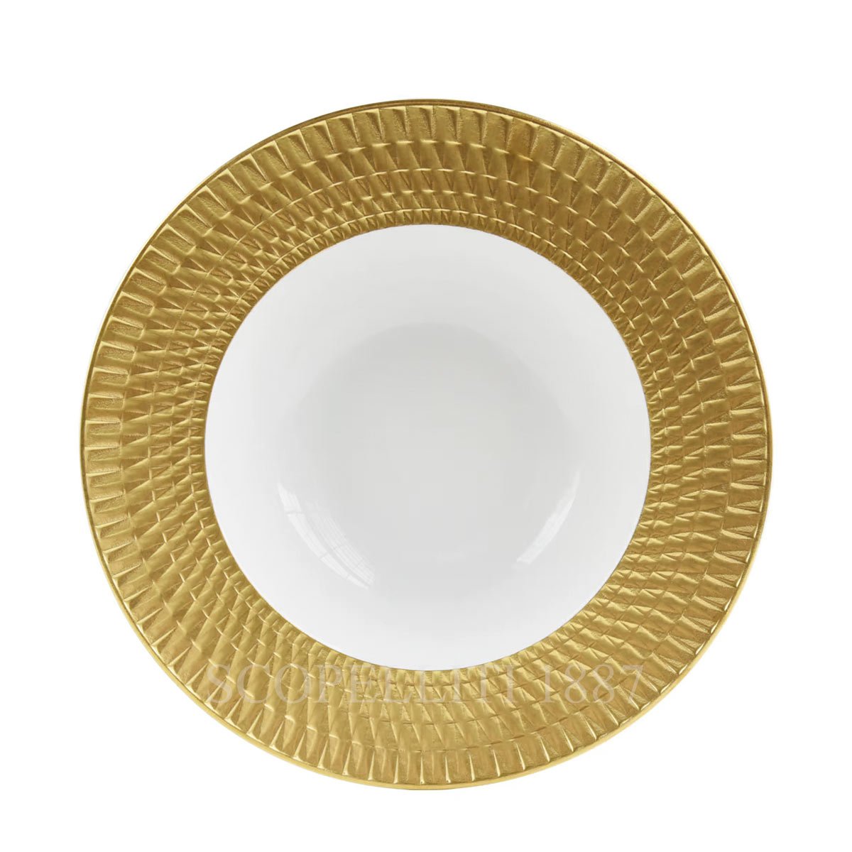 The Bernardaud Twist Gold Rim Soup Plate is an exquisite porcelain creation enhanced with gold detailing. Designed for serving soups, consommés, or elegant appetizers, this plate combines refined functionality with timeless French luxury. The Twist Gold collection draws inspiration from Japanese rice paper screens, origami folding, mid-century furniture braiding, and modern 3D graphics. The result is a subtle geometric motif, delicately twisted in motion, offering a unique interplay of depth and light. Produced in Bernardaud’s historic Limoges factory, active since 1863, this piece embodies the maison’s tradition of craftsmanship and innovation, making it an essential element of a refined table setting.