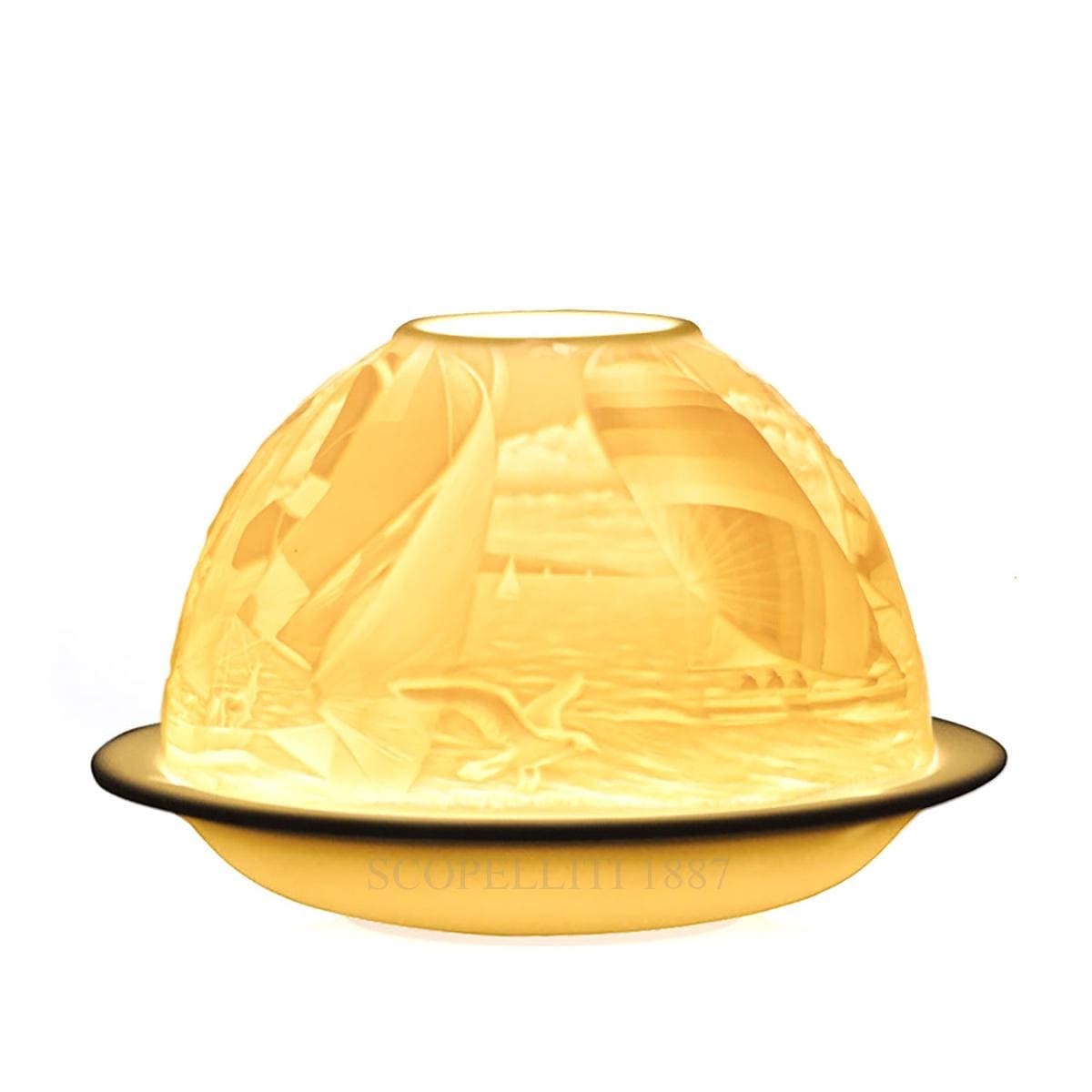 Votivelight in bisque porcelain with Sailboats engraved motif. Gift box included. Dimensions: Height 7.5 cm – Diameter 11.3 cm Burning time: up to 6 hours A lithophane (French: lithophanie) is an etched or molded artwork in very thin translucent porcelain that can only be seen clearly when back lit with a light source. The Bernardaud Votivelight was made with this traditional engraving technique on a fine bisque (non-glazed) porcelain that was invented in Limoges in 1828. Bernardaud still use it to craft beautiful votives that come in a wide variety of decor. The glow of the candle shines through the raised and carved surface of the votive, contrasting light against shadow and thus revealing its richly detailed design.