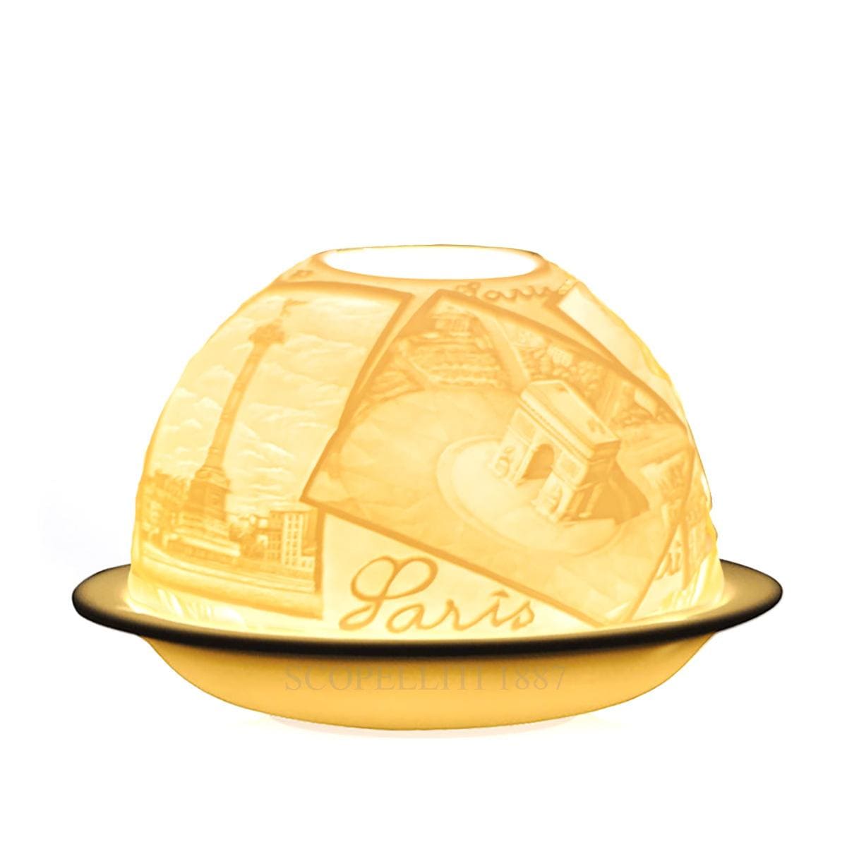 Votivelight in bisque porcelain with Scenes of Paris engraved motif. Gift box included. Dimensions: Height 7.5 cm – Diameter 11.3 cm Burning time: up to 6 hours A lithophane (French: lithophanie) is an etched or molded artwork in very thin translucent porcelain that can only be seen clearly when back lit with a light source. The Bernardaud Votivelight was made with this traditional engraving technique on a fine bisque (non-glazed) porcelain that was invented in Limoges in 1828. Bernardaud still use it to craft beautiful votives that come in a wide variety of decor. The glow of the candle shines through the raised and carved surface of the votive, contrasting light against shadow and thus revealing its richly detailed design.