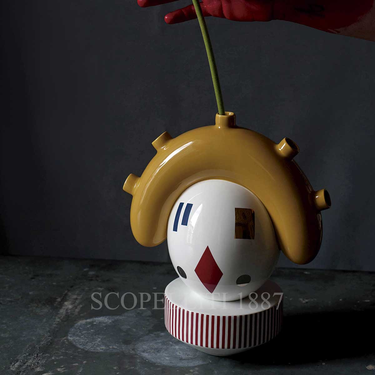 Bosa Georgi Tulip Vase Theatre Hayon in ceramic is designed in glossy white glaze with red and lustrous gold precious details. Designed by famous artist and designer Jaime Hayon special for Bosa. Gift box included. Size: L 26,5 x H 21 cm Designed by Jaime Hayon for Bosa, the ‘Georgi Tulip’ vase is part of the ‘Theatre Hayon’ collection of vases and tea pots. Handmade in Italy by skilled craftsman, this unique piece is adorned with Hayon’s signature iconography. Please note that due to the handcrafted nature of this product, colours and finishes may vary.