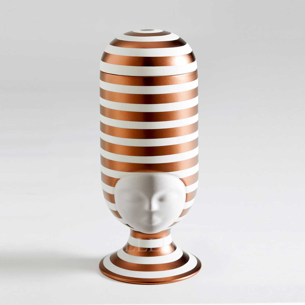 Bosa Sisters Clara Copper White in ceramic is enriched with precious copper metal details. Designed by a spanish artist Pepa Reverter special for Bosa. Gift box included. Size: L 16 x H 37.5 cm The Bosa Sisters collection consists of five sculptures vases made of white ceramic. The five pieces are available in different finishes, all of them are made and painted by hand. The design of this elegant and tender collection comes from the hand of the artist Pepa Reverter, who says of these pieces that they are a tribute to women of all cultures and all times. They have been designed in Barcelona and this is what brings them a cosmopolitan and a Mediterranean point of view towards life. Their names are Louise, Frida, Sofia, Helen and Clara, they are sisters. Imaginative, happy and caring. They like the beauty of fair and open spaces, where their heads full of harmony and creativity can transmit light. A collection of vases that pays tribute to women of all cultures and all times which is continuously enriched with colors and textures: launched in 2015, the romantic version of Clara with a heart and available in colors bright red and white satin finish with precious metals; in 2016 new decorations and a new detail for Clara, Louise e Helen; il 2018 Pepa Reverter plays with strong colors patterns, full backgrounds and ethno patterns