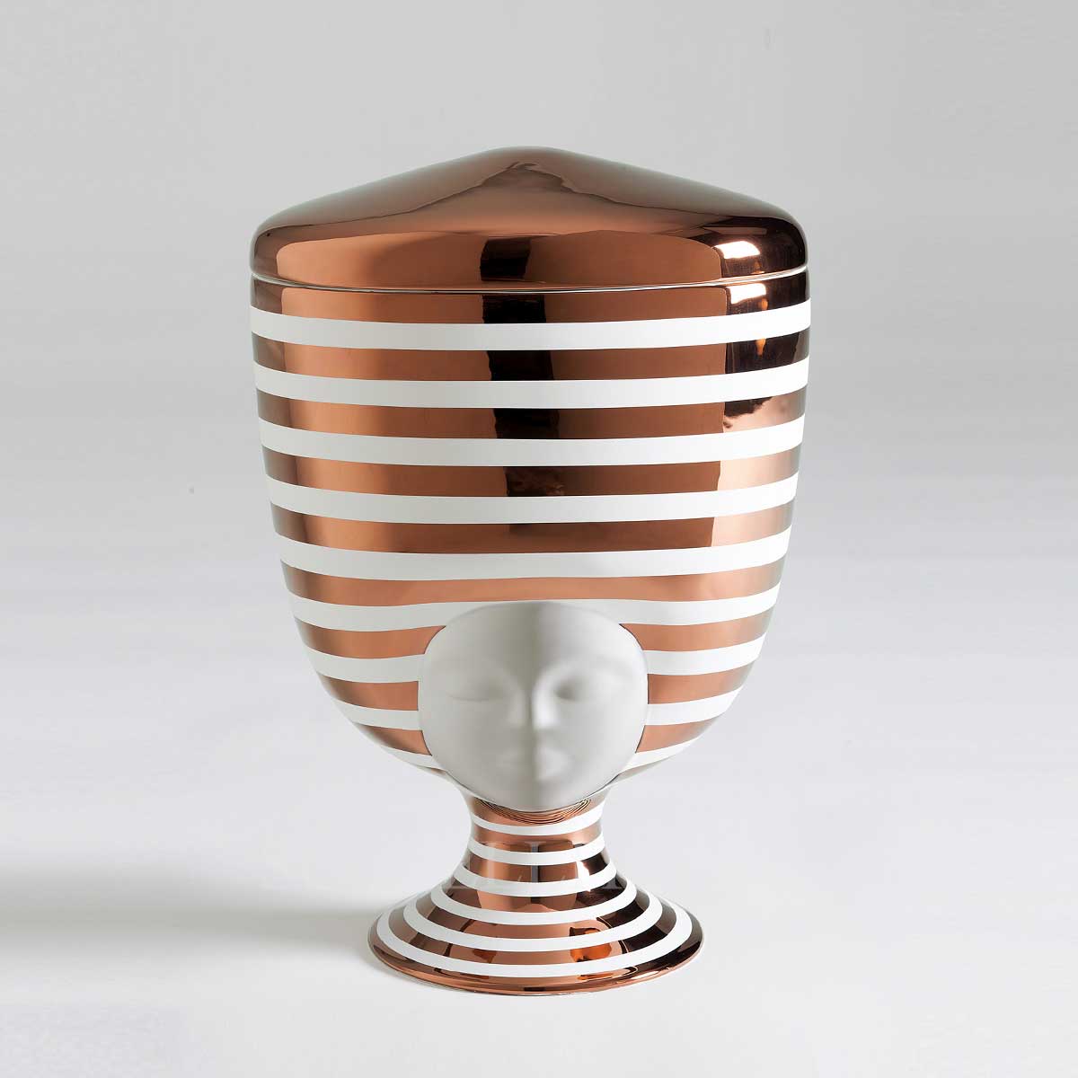 Bosa Sisters Louise Copper White in ceramic is enriched with precious copper metal details. Designed by a spanish artist Pepa Reverter special for Bosa. Gift box included. Size: L 26 x 18 x H 37 cm The Bosa Sisters collection consists of five sculptures vases made of white ceramic. The five pieces are available in different finishes, all of them are made and painted by hand. The design of this elegant and tender collection comes from the hand of the artist Pepa Reverter, who says of these pieces that they are a tribute to women of all cultures and all times. They have been designed in Barcelona and this is what brings them a cosmopolitan and a Mediterranean point of view towards life. Their names are Louise, Frida, Sofia, Helen and Clara, they are sisters. Imaginative, happy and caring. They like the beauty of fair and open spaces, where their heads full of harmony and creativity can transmit light. A collection of vases that pays tribute to women of all cultures and all times which is continuously enriched with colors and textures: launched in 2015, the romantic version of Clara with a heart and available in colors bright red and white satin finish with precious metals; in 2016 new decorations and a new detail for Clara, Louise e Helen; il 2018 Pepa Reverter plays with strong colors patterns, full backgrounds and ethno patterns