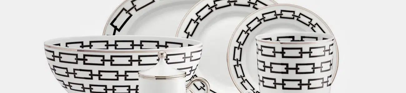 Designed by Gio Ponti in 1926, the Ginori 1735 Catene Black collection exudes modern sophistication with its bold interlocking chain motif in deep black on fine white porcelain. Platinum accents along the edges add a touch of refined luxury, enhancing its sleek and contemporary aesthetic.