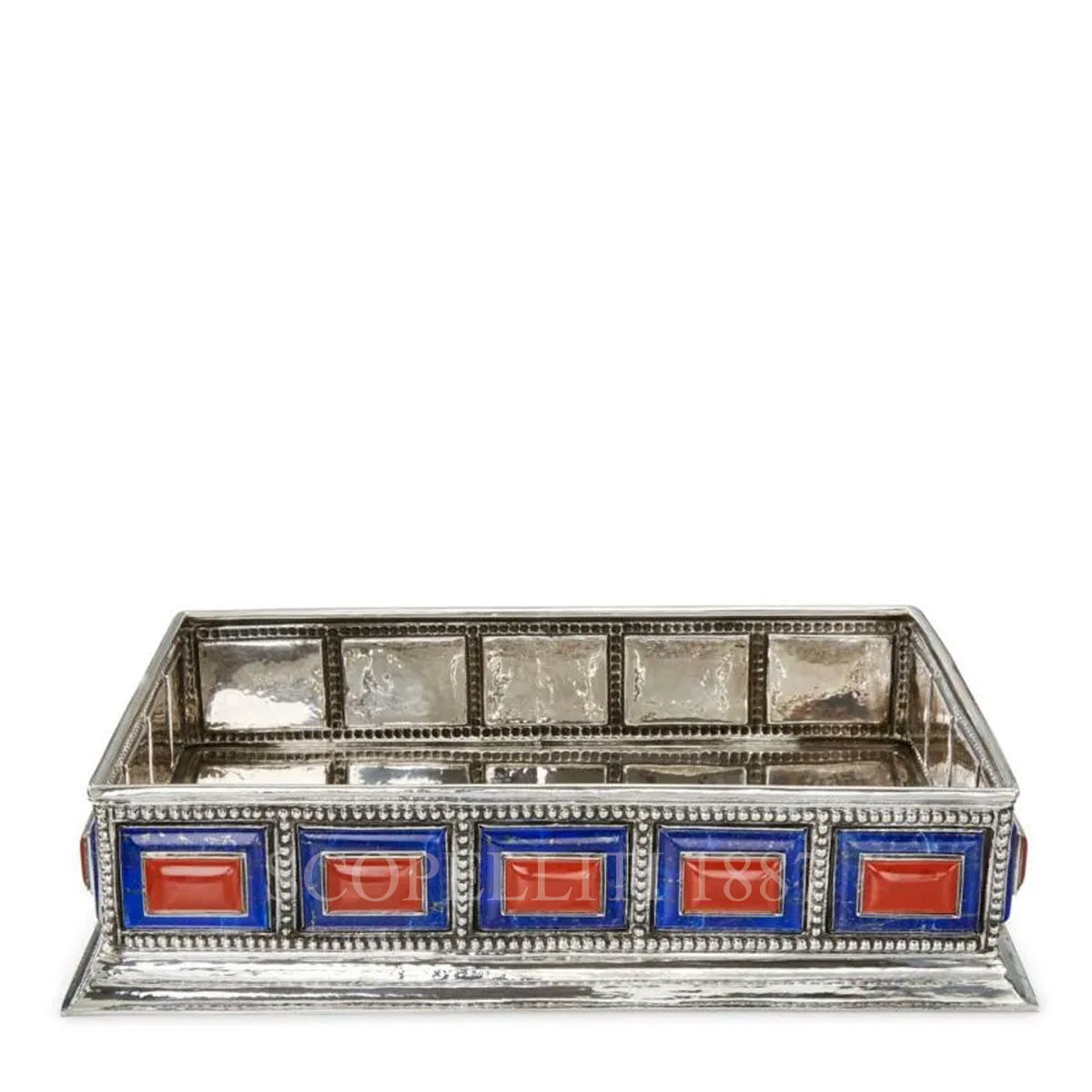 Doge Large Bowl. Bowl in silver and other materials set with lapis. Large Bowl in red jasper and lapis. Dimensions: 49.5 x 39 cm – height 12 cm The Doge collection recalls the splendours of Venetian art, from Renaissance to Baroque times, and reminds us of the huge admiration and respect that Buccellati has always declared for the city of Venice. The collection is composed of impressive oval, round, octagonal or dodecagonal very large bowls in hand-hammered and chiselled silver, furtherly enhanced with big pearls, with a preference for Osmenia pearls, or with combined elements of malachite, lapis and red jasper.