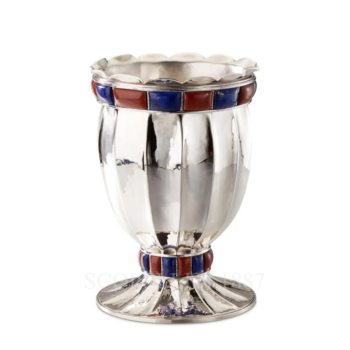 Doge Vase. Vase in silver set with lapis. Vase with lapis and red jasper. Dimensions: diameter 13.5 cm – height 25 cm The Doge collection recalls the splendours of Venetian art, from Renaissance to Baroque times, and reminds us of the huge admiration and respect that Buccellati has always declared for the city of Venice. The collection is composed of impressive oval, round, octagonal or dodecagonal very large bowls in hand-hammered and chiselled silver, furtherly enhanced with big pearls, with a preference for Osmenia pearls, or with combined elements of malachite, lapis and red jasper.