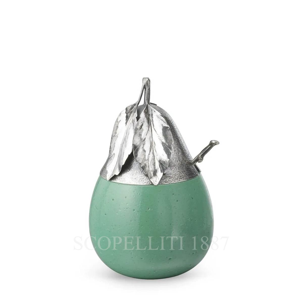 Jar in silver and Murano glass. Green Pear Jam Jar. Dimensions: diameter 11 cm – height 17.5 cm The Murano Collection witnesses the close link between Buccellati and Venice, all based on intellectual and historic affinities, sharing of elegance and timeless beauty. The combination between the light and amazing Murano glasses and the silversmithing art of Buccellati shows the perfect union of traditions and know-how experiences which characterize these creative arts, both standing out for the top quality of materials and the prestige of the workmanship.