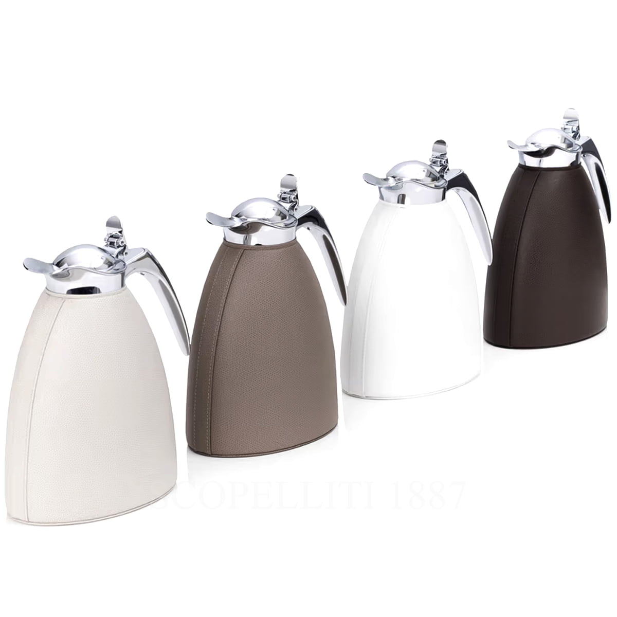 Carafe Pigment Bagatelle in Leather is a partially printed calfskin golf leather covered insulated stainless steal carafe with chrome-plated finish. Gift Box included. Made in Italy. Capacity: 1 L Height: 24 cm Pictured in Calfskin Golf Leather. Order as pictured, or customize by picking a color of your choice here for the corresponding leather material. Please specify the color code in the Order Notes section upon checkout. The “Bagatelle” insulated carafes by Pigment France add a touch of luxury to everyday life. The oval thermos jugs impress with their perfect workmanship and raffinesse. The special detail of the “Bagatelle” thermos flask by Pigment is its leather covering. The biggest challenge is to cover the curved surfaces flawlessly with leather. The craftsmen of the Pigment-Manufaktur are among the few who are able to do this craftsmanship perfectly. The high-quality calf leather comes from northern Europe. It is tanned with a special treatment that makes it waterproof and scratch-resistant. The thermos flasks are made of chrome-plated brass. The insulating glass insert made of double-walled alfiDur tempered glass inside ensures excellent insulating performance. It is able to maintain liquid’s warm temperatures for up to 12 hours and cold temperatures for up to 24 hours.