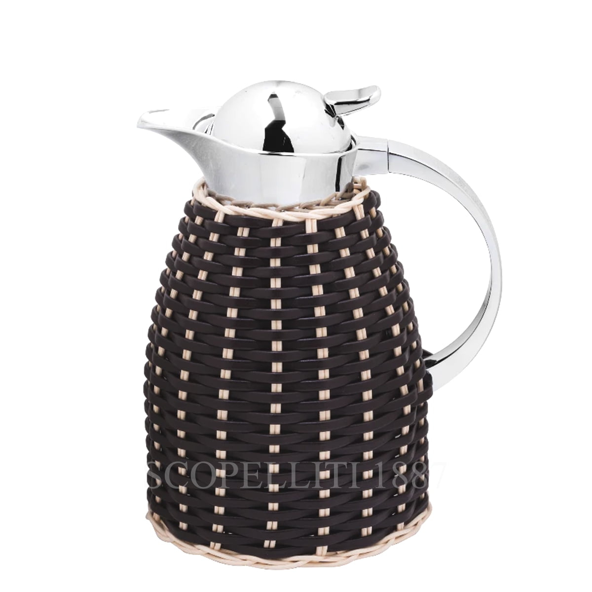 Carafe Pigment Chantilly in Leather and Rattan is a insulted stainless steel carafe partially covered in woven leather and rattan with chrome-plated finish. Gift Box included. Made in Italy. Capacity: 1,5 L Height: 25 cm Pictured in Natural Rattan combined to Calfskin Nappa Leather. Order as pictured, or customize by picking a color of your choice here for the corresponding leather material. Please specify the color code in the Order Notes section upon checkout. Available only with combination of rattan and leather. The luxury brand Pigment France is a master in refining tableware with various materials such as straw, willow, rattan and leather. The products impress with their beauty and high quality. Two chamber structure able to maintain liquid’s warm temperatures for up to 12 hours and cold temperatures for up to 24 hours. Precise pouring thanks to the specially developed hinged lid with one-hand operation.