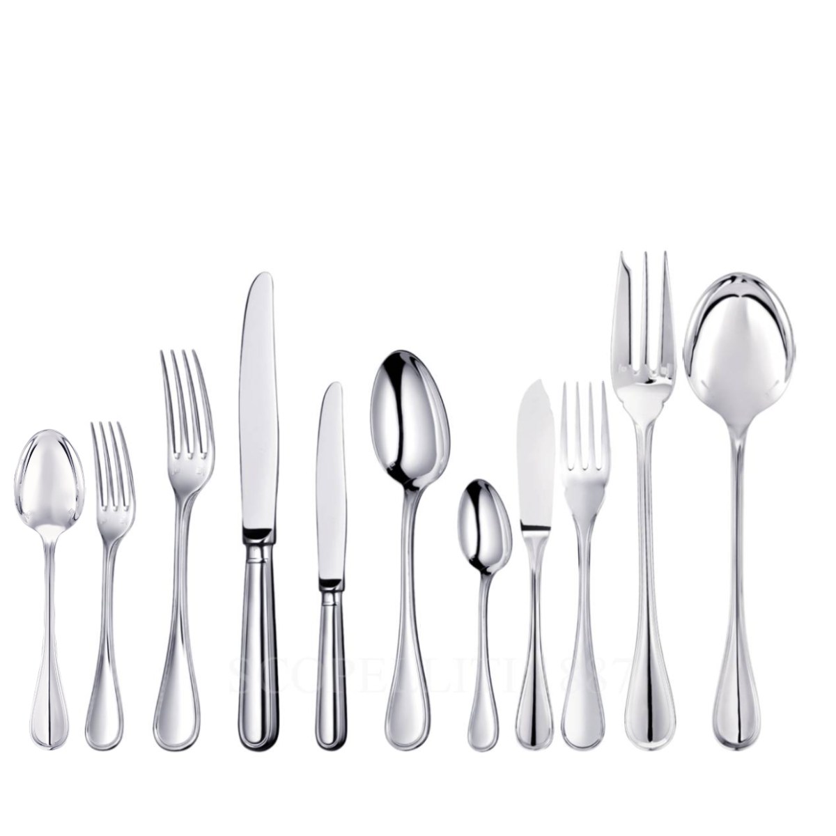 The Christofle Albi 110 pcs Stainless Steel Cutlery Set includes 12 pieces of 9 utensil types for each guest, plus 2 serving utensils. Each type of utensil has been carefully designed for specific dining functions: