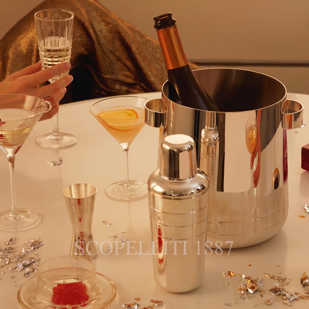 The conductivity of the silver plated is ideal for presenting and keeping the champagne cool for a longer time. Christofle expands its GRAPHIK collection launched in 2015, from crystal to silver plated. The resolutely modern and elegant design of this collection is inspired by crystal cut according to the traditional pattern made by glassmakers. The GRAPHIK collection is evolving to offer a full range focused on barware and the preparation of cocktails. Cocktails are on every tables: colorful and tasty, they have established themselves as the trendy drink of the moment. The GRAPHIK pattern in its modern and emblematic size is part of a different rhythm from one piece to another. All the collection is made in France.