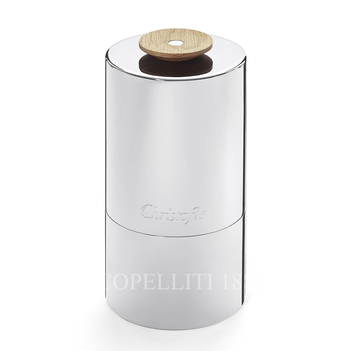 - Materials: Polished stainless steel; oak wood insert and lid knob