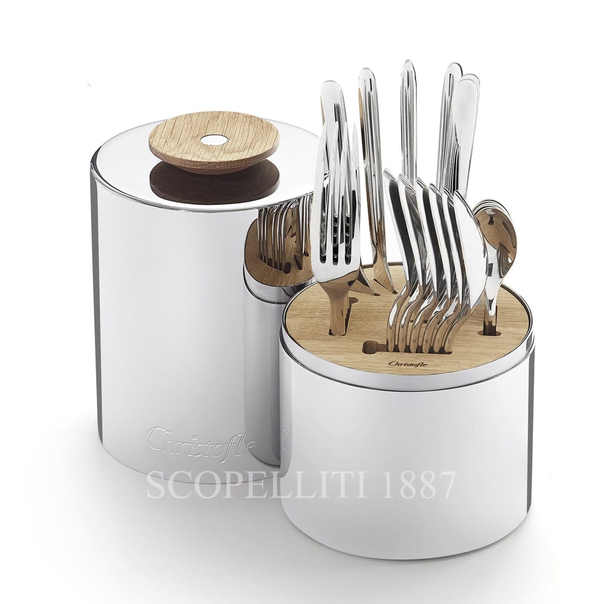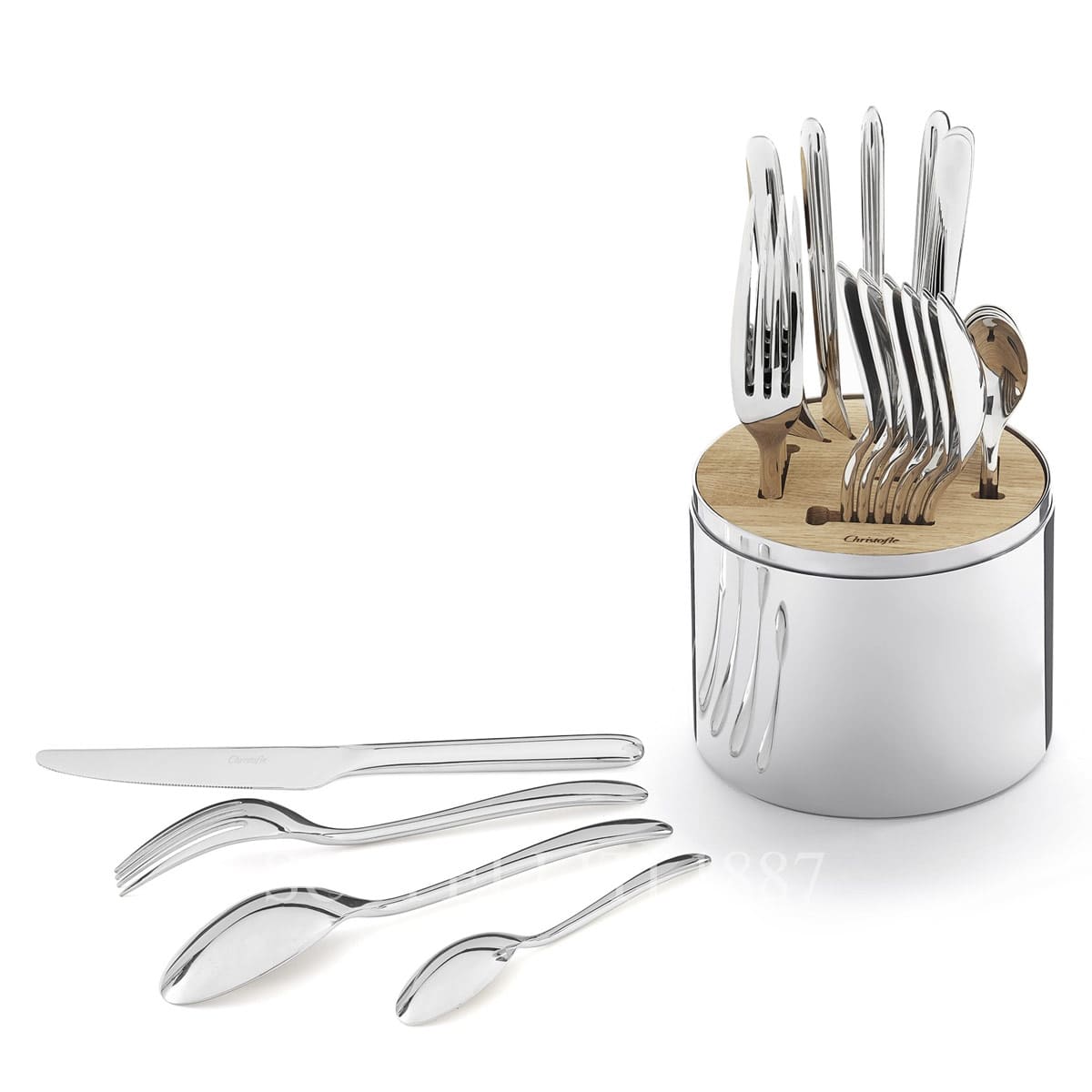 https://www.youtube.com/watch?v=y7eM4gSCb3Y The Christofle Essentiel Cutlery Set – 24-Piece Stainless Steel Flatware with Oak Wood Case is a modern, practical, and effortlessly stylish set that brings contemporary elegance to any table setting. Designed for versatility and everyday use, this 24-piece stainless steel flatware set is stored in a sleek cylindrical oak wood case with a stainless steel exterior — perfect for modern kitchens, casual brunches, or elegant outdoor gatherings. Whether you’re hosting a garden party, setting a stylish brunch table, or enjoying a picnic, the Christofle Essentiel set is both functional and visually striking. The compact, upright design makes it easy to transport and display, while the light-toned oak wood insert provides dedicated slots for each utensil. What’s Included: