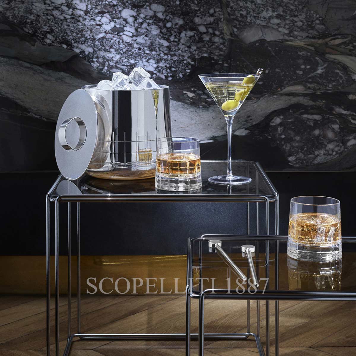 The insulated ice bucket has the iconic Graphik pattern positioned at the base of the piece and further highlighted by the exceptional mirror polish.