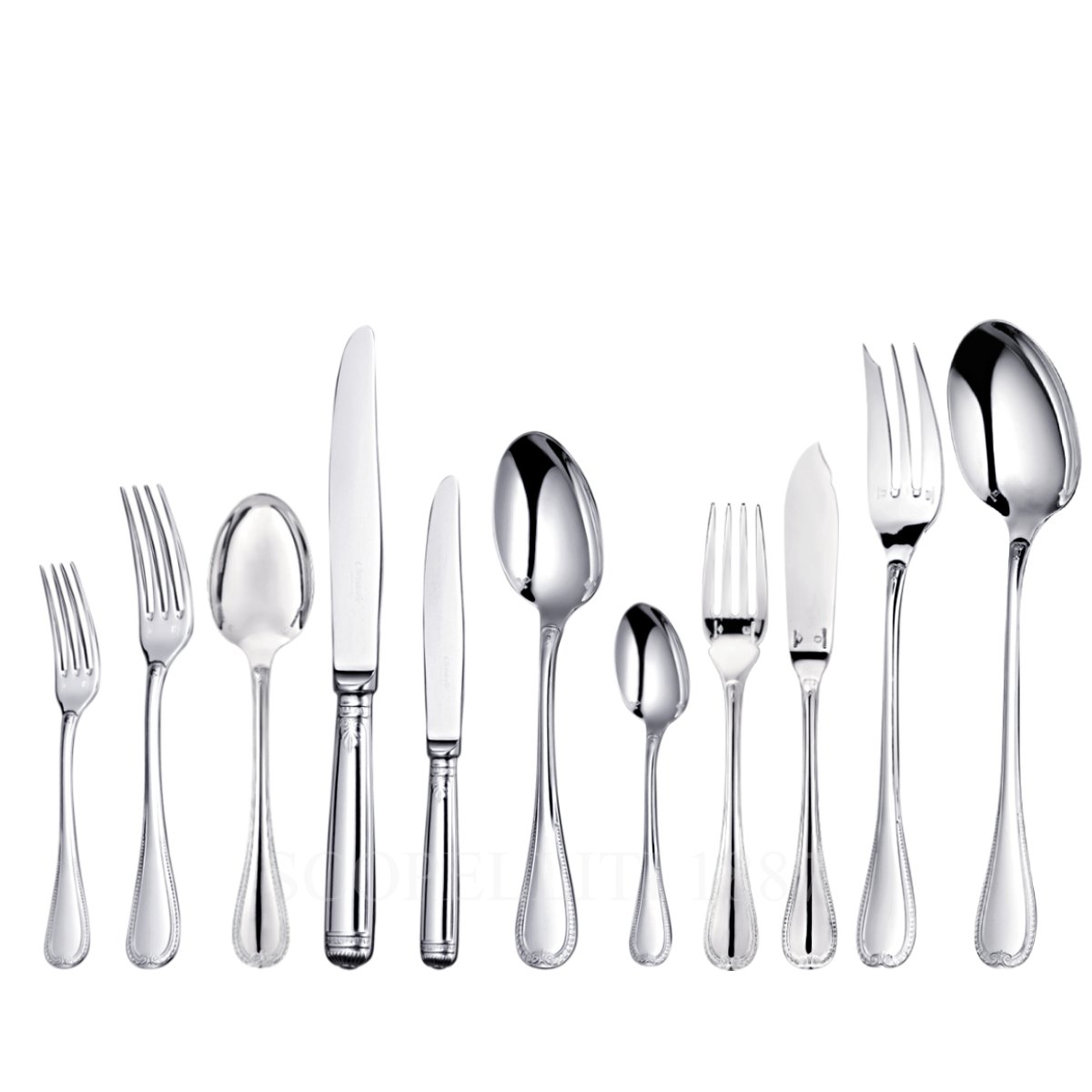 The Christofle Malmaison 110 pcs Silver Plated Cutlery Set includes 12 pieces of 9 utensil types for each guest, plus 2 serving utensils. Each type of utensil has been carefully designed for specific dining functions: