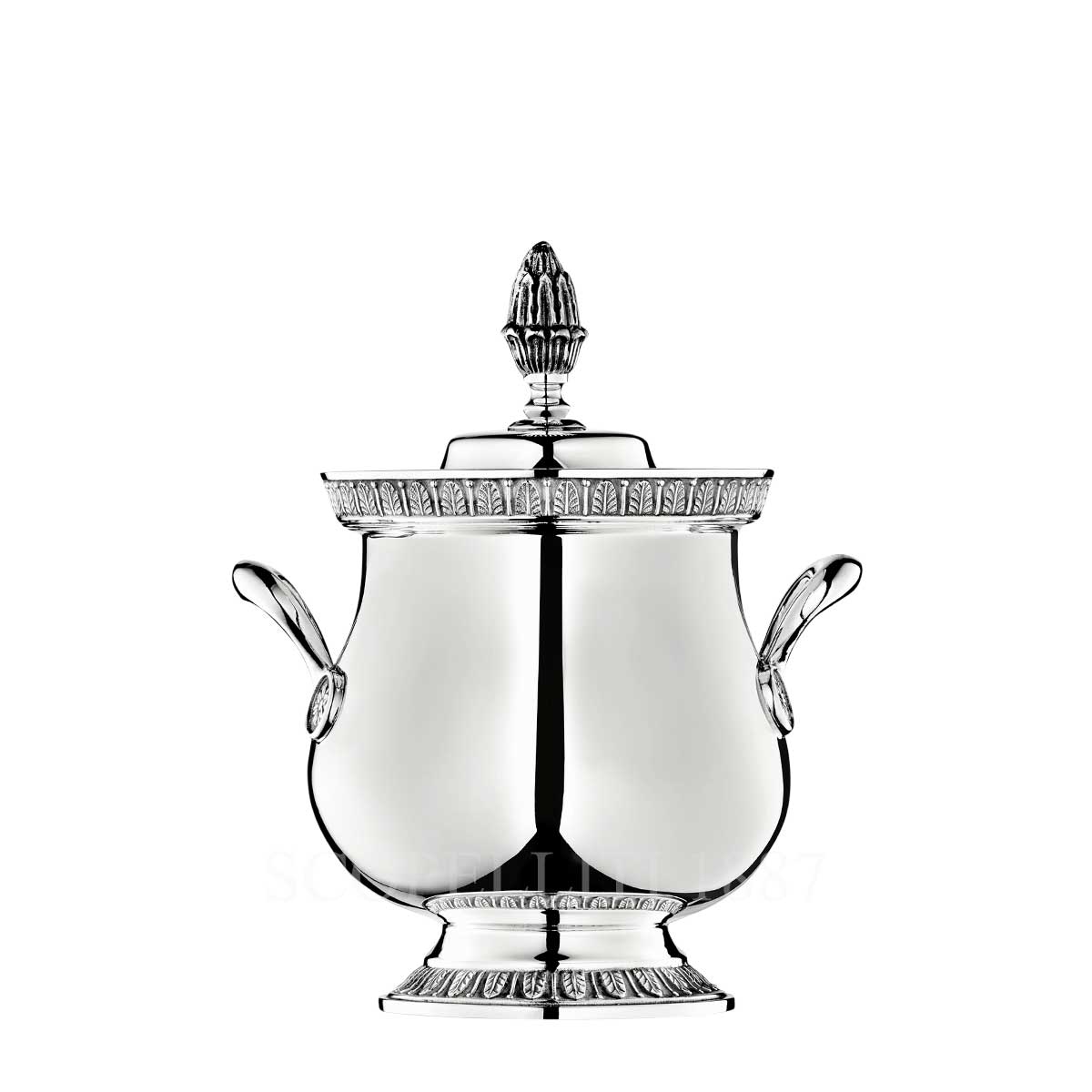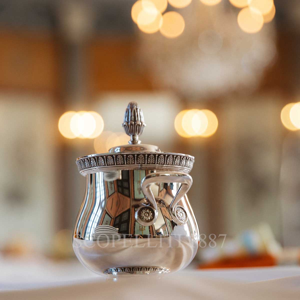 Add a touch of timeless French elegance to your table with the Christofle Malmaison Silver Plated Sugar Bowl. Inspired by the grandeur of the Napoleonic Empire, this exquisite sugar bowl features the refined details that define the Malmaison collection, such as delicately engraved palmette borders and a sculpted lotus blossom that crowns the lid. Its graceful shape and lustrous finish make it a standout piece in any tea or coffee service. Crafted from fine silver plated material, this sugar bowl reflects Christofle’s long tradition of exceptional craftsmanship and attention to detail. With a generous capacity, it is perfect for holding sugar cubes or granulated sugar for your guests. The Christofle Malmaison Silver Plated Sugar Bowl pairs beautifully with the matching Malmaison Creamer, Teapot, and Coffeepot, allowing you to create a fully coordinated and luxurious beverage setting.