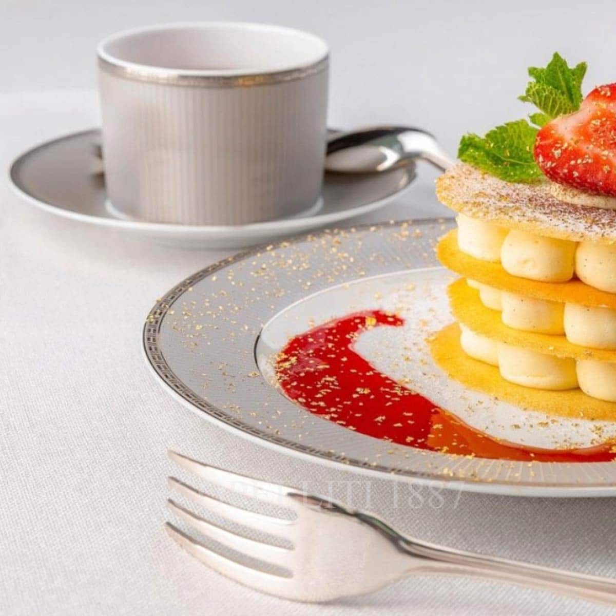 Metropolis by French house Christofle. Spectacular and stylish design distinguishes all Metropolis products, where the classics are embodied in snow-white Limoges porcelain, impeccable shapes and noble decor. The legendary Christofle brand produces not only world-famous silverware, but also prestigious porcelain collections. Dimension: saucers 5 5/8 in, teacups 2 1/4 h x 3 1/8 in