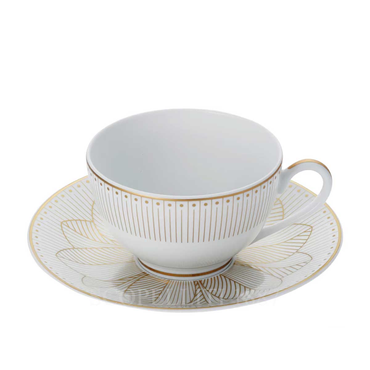 This elegant Christofle Tea Cup and Saucer Malmaison Imperiale set is made from high-quality white Limoges porcelain and features intricate gold accents and geometric designs. Part of the Malmaison Impériale collection, this set takes inspiration from the classic Malmaison design and gives it a fresh, modern twist. Its refined look adds a touch of luxury to any table setting, perfect for serving tea in style. The set consists of 2 Christofle Tea Cup and Saucer Malmaison Imperiale in gold. Experience the elegance of the Christofle Tea Cup and Saucer Malmaison Imperiale Gold set and add a touch of beauty to your table setting.
