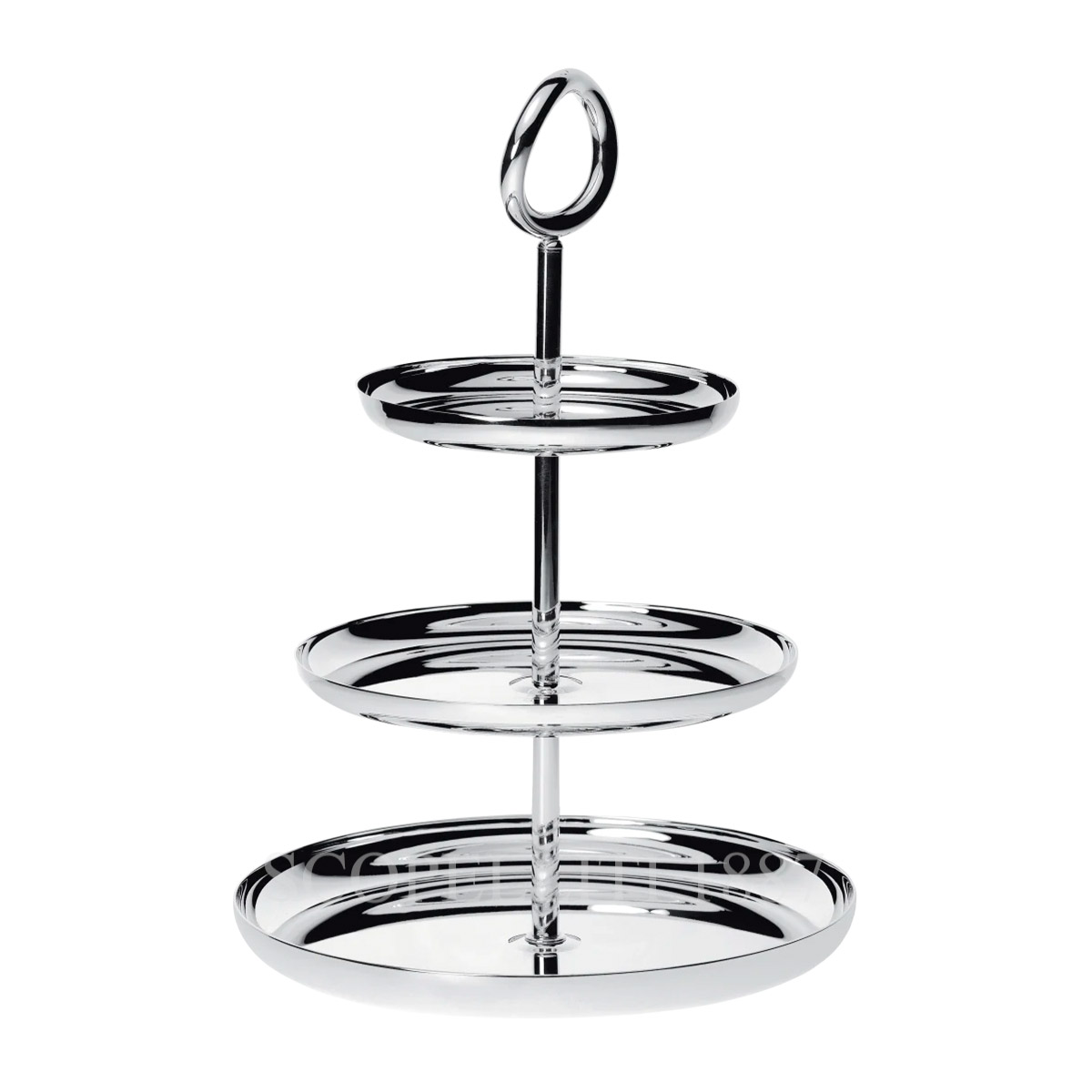 The silver-plated Vertigo 3-tier dessert stand adds modern and playful elegance to your dessert table or high-tea. Perfect for serving cupcakes, breakfast pastries, mini desserts or small sandwiches. Vertigo’s bold motif — a subtly asymmetrical, thick ring often placed playfully askew — can be found on every piece in the collection designed by Andrée Putman.