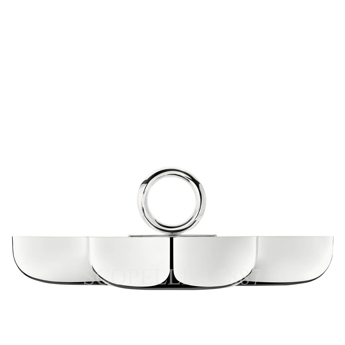 Serve in style with the Christofle Vertigo Three Part Server Large, a beautifully crafted piece perfect for entertaining or everyday elegance. This large snack tray features three rounded bowls arranged around a sleek central handle, ideal for offering nuts, olives, candies, or small hors d’oeuvres. It also makes a chic catchall for trinkets or jewelry. Each bowl is finished with a radiant mirror polish and supported by the signature Vertigo motif, a bold, thick ring handle set slightly askew, designed by Andrée Putman. This playful, modern detail brings to Christofle Vertigo Three Part Server Large a touch of sculptural sophistication to your table or interior. Also available in a smaller size.