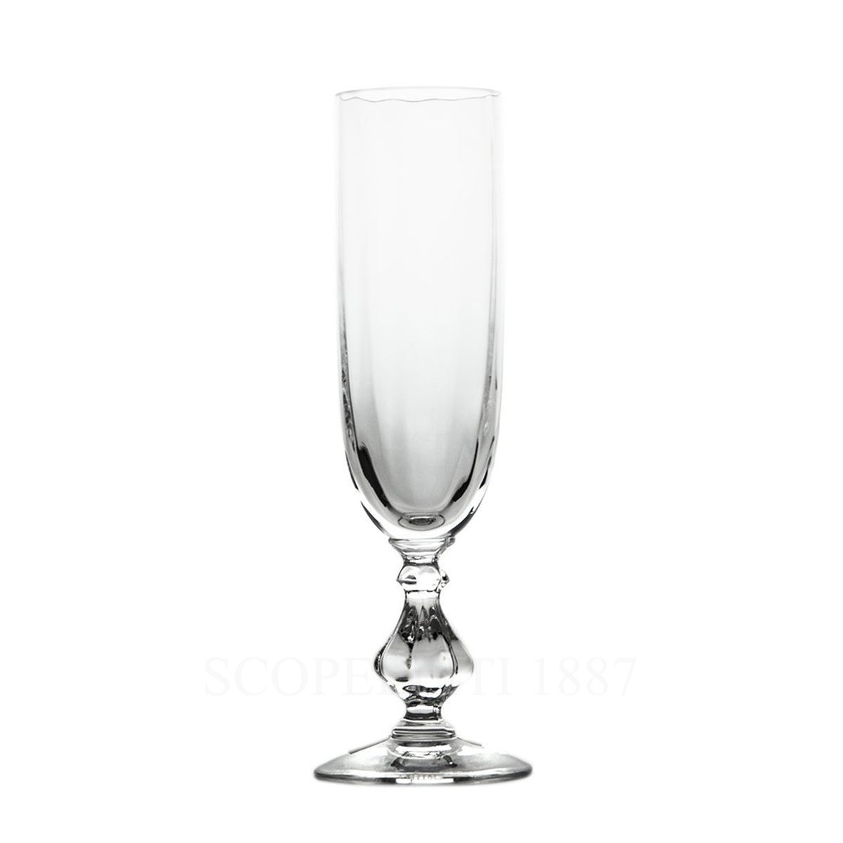 The optical crystal glass of Cristal de Sèvres Choiseul champagne flute slightly reflects the light creating a perfect contrast between shapes and reflections. A timeless classic design. Exceptional glass in terms of hardness, shine and transparency.