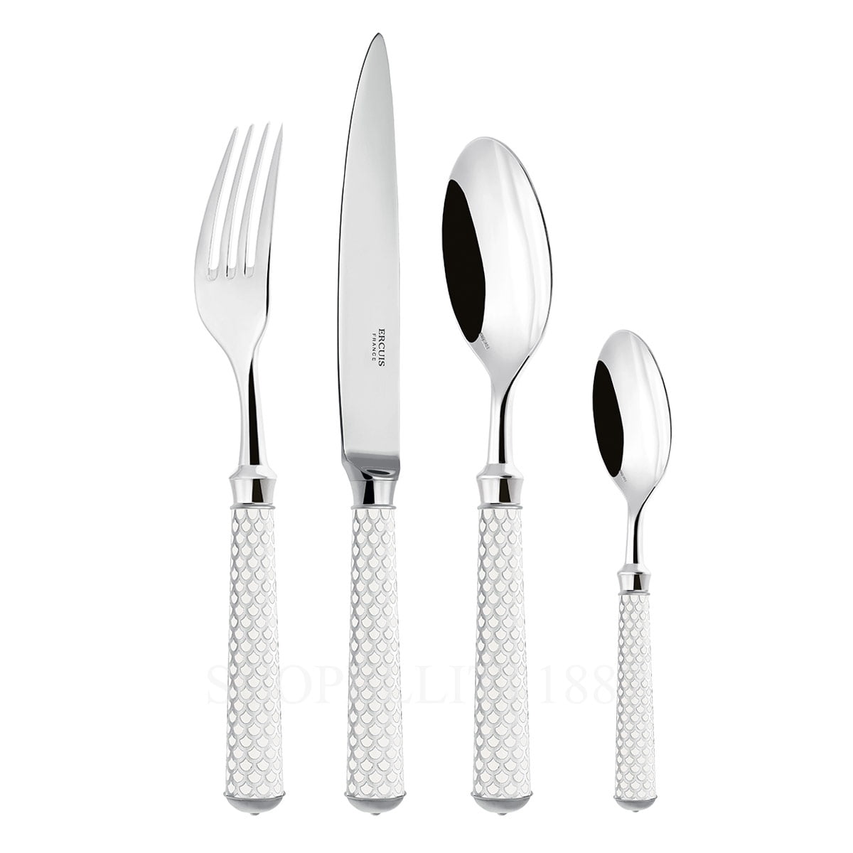 Ercuis Coupole white pattern cutlery set is a silver plated collection of high-end cutlery produced by Ercuis, a French luxury brand that has been creating exquisite tableware and decorative objects. The Coupole collection features sleek and modern designs, with a polished silver plated finish that is both elegant and durable.