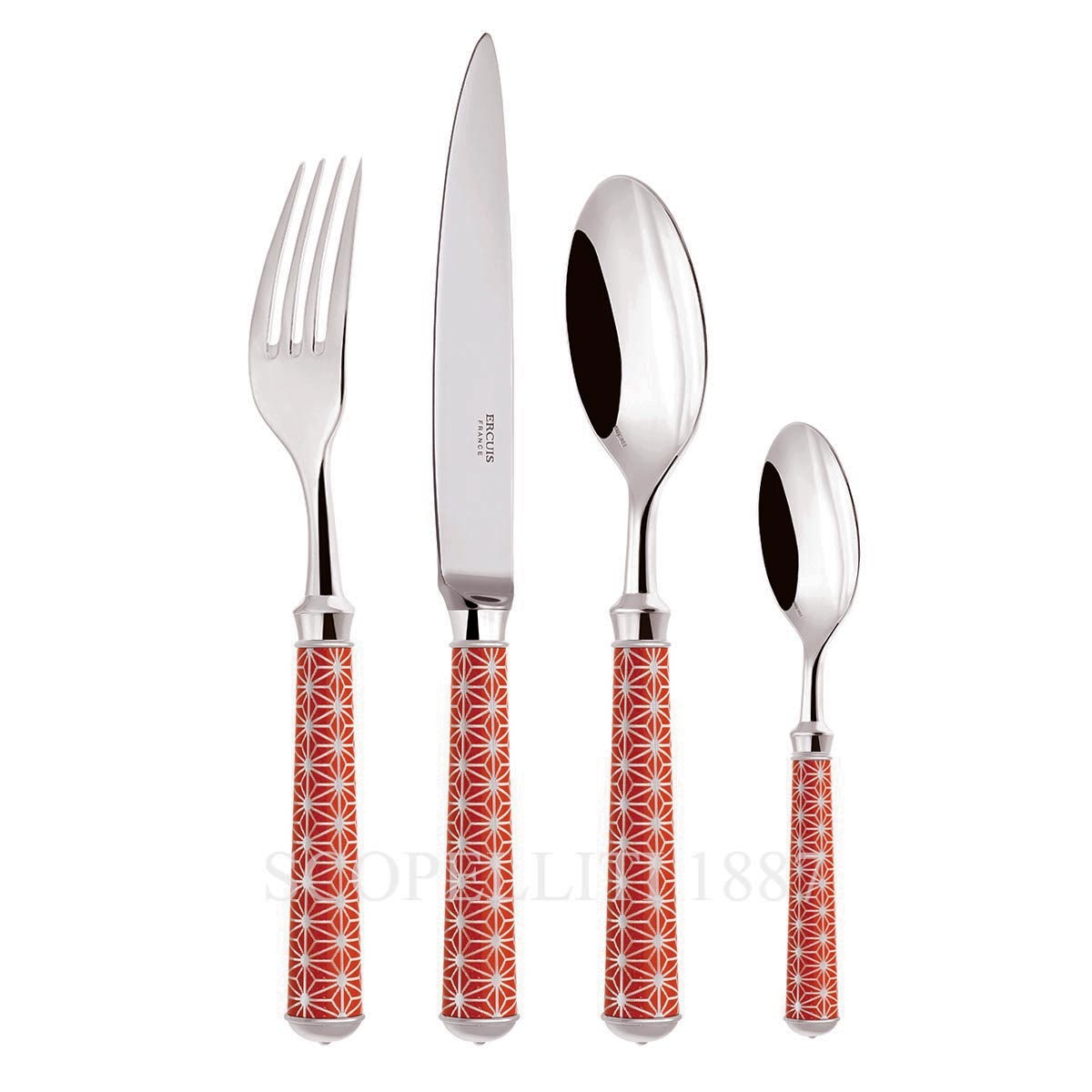 The Ercuis Arts Décoratifs collection offers exceptional customization with nine intricate engraving designs, each adding a unique decorative touch to the pieces. The handles come in a stunning palette of thirty lacquer colors, allowing you to match your table setting to your personal style. For added elegance, choose between luxurious gold-plated or silver-plated finishes to elevate any dining occasion.