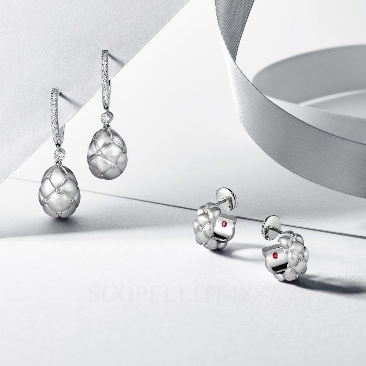 Fabergé Treillage Brushed White Gold Diamond Huggie Hoop Earrings come adorned with 10 round brilliant cut white diamonds, set in 18 karat brushed white gold. The earrings are 12 mm tall, 6 mm wide and 2 mm thick. Features: 18kt White Gold 10 Round Brilliant Cut White Diamonds Total Weight 0.25ct 2 Round Rubies Total Weight 0.02ct In keeping with Fabergé’s penchant for surprise, a ruby, responsibly sourced from Gemfields Montepuez ruby mine in Mozambique, is hidden at the inside of each earring. Rubies are a symbol of passion, prosperity and protection, making them the perfect secret addition to this striking new collection. The Treillage Collection is inspired by the Diamond Trellis Egg, created by Fabergé in 1892. The evocative designs, with their soft, tactile and gem-set quilting, represents the perfect marriage of heritage and modernity.Please note that in the interests of hygiene and for your protection, earrings and all other piercing jewelery are excluded from our website exchange policy. For more info, consult our F.A.Q. page.