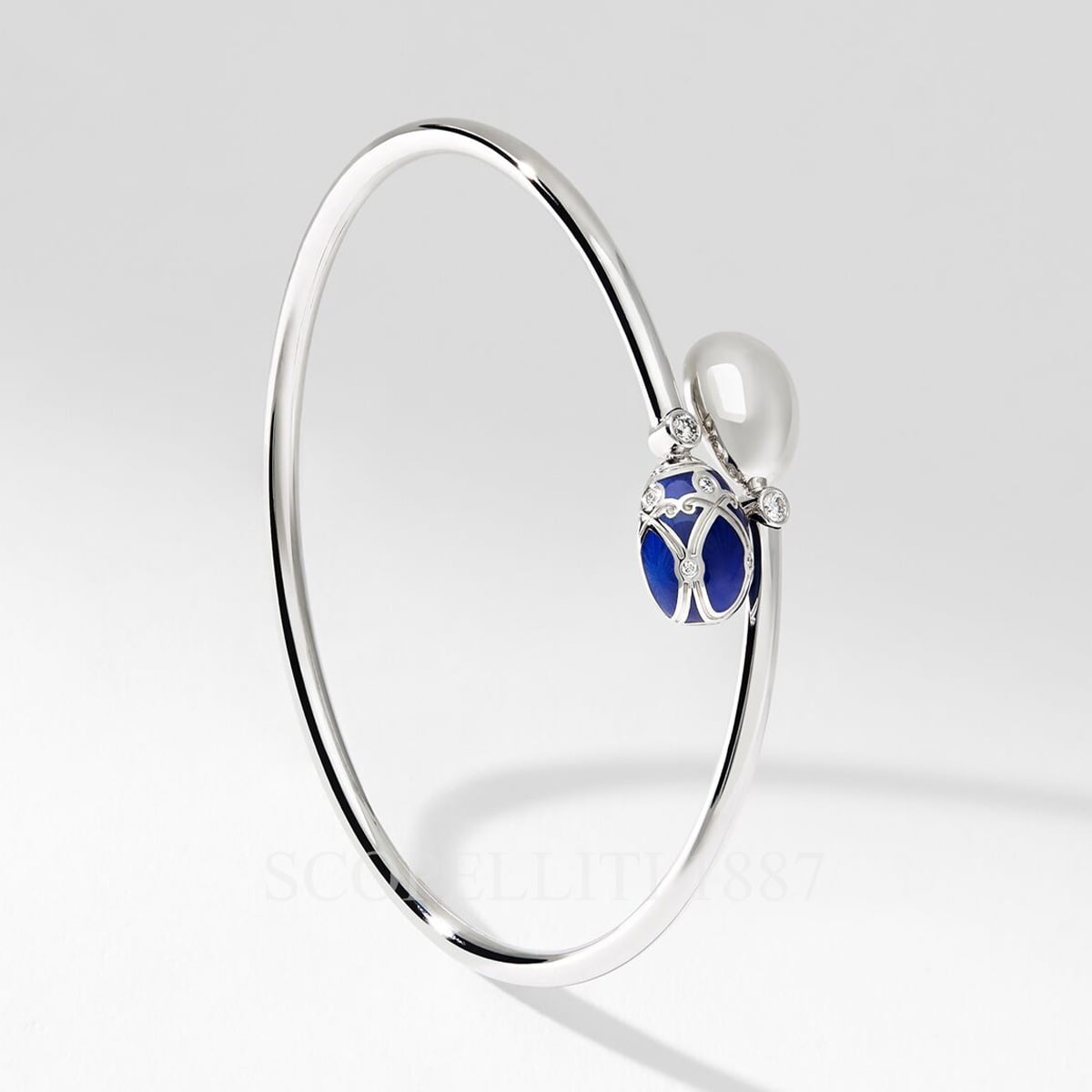 The Heritage Palais White Gold Diamond and Royal Blue Guilloché Enamel Crossover Bracelet draws inspiration from Fabergé’s original jewelled masterpieces. Fabergé 18kt White Gold Diamond Royal Blue Crossover Bangle Palais comes set in 18 karat white gold, adorned with a royal blue guilloché enamel egg, a simple gold egg and 9 brilliant cut round white diamonds. The measurement of the egg shape is 14.51 mm in length, 10.61 mm in height and 5.25 mm in width. Fabergé has concealed a ruby on the inside of the bracelet – ‘a hidden gem’ that touches the skin to signify the special bond held with a loved one. It features: