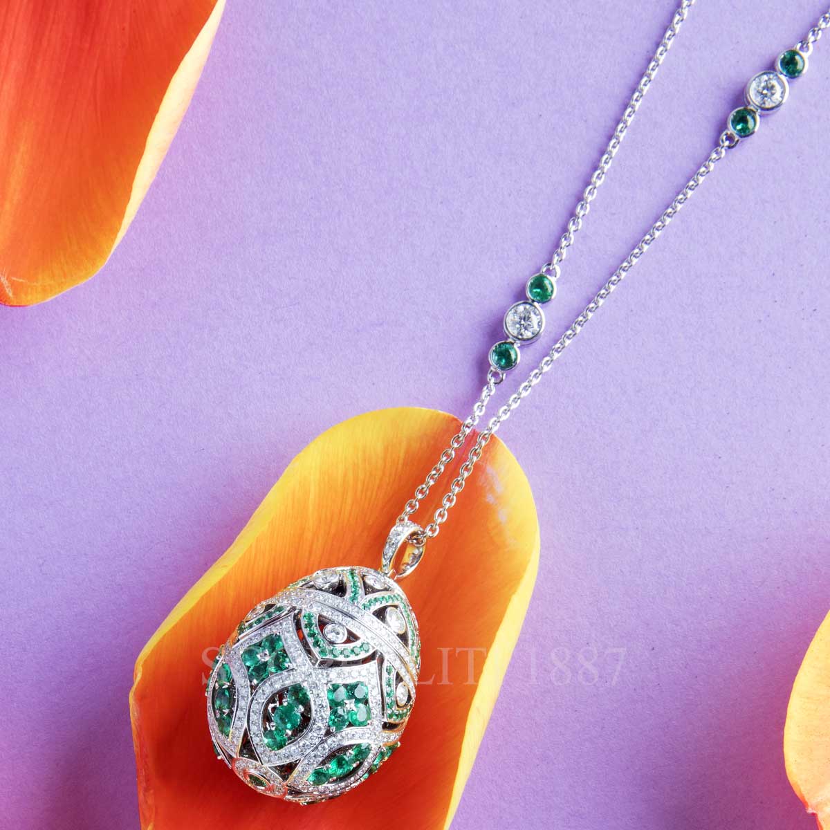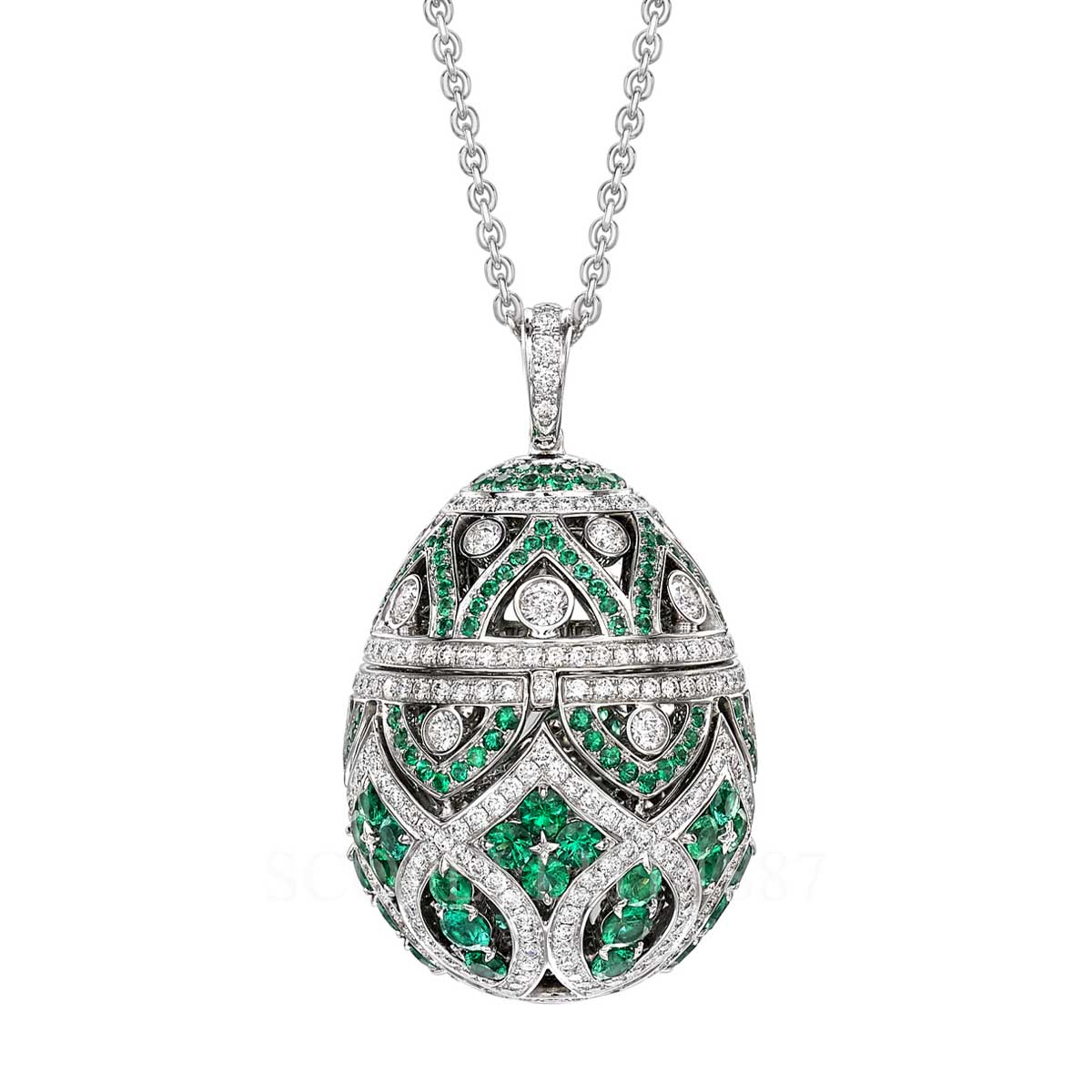 Zenya Emerald Egg Pendant features round emeralds and round white diamonds, set in 18 karat white gold. The Fabergé Imperial Collection is inspired by the jewelled splendour of the Imperial Romanov court, and evokes the rhythms of the Russian seasons, whether literal or metaphorical. Fabergé 18kt White Gold Emerald Egg Pendant Imperial Zenya features: