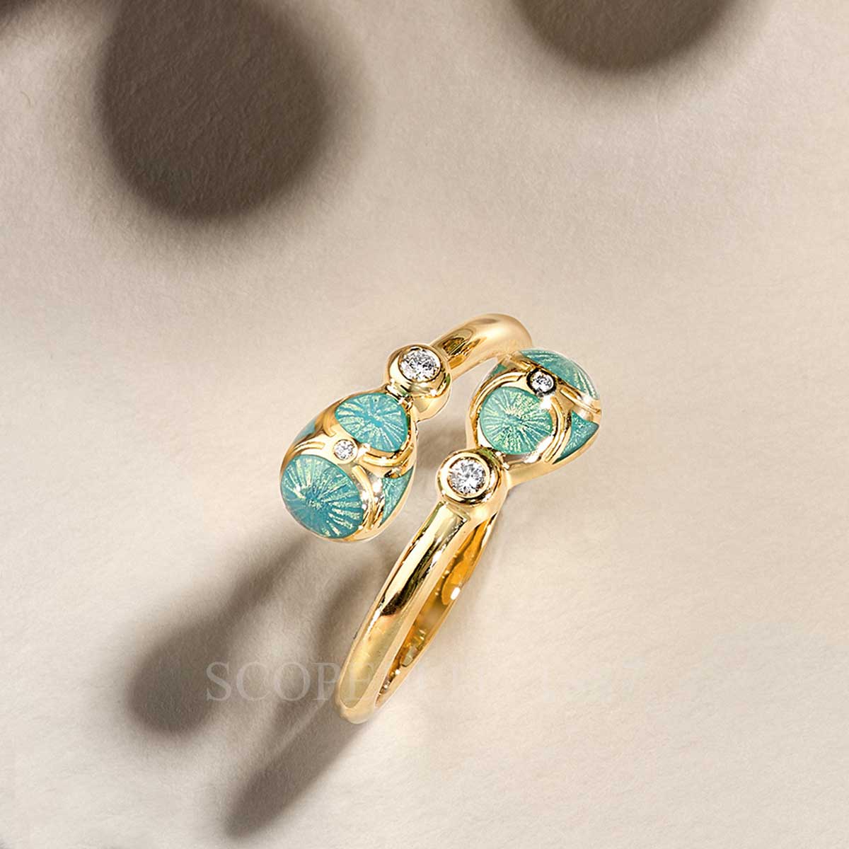 Fabergé 18kt Yellow Gold Turquoise Crossover Ring Heritage is set in 18 karat yellow gold and adorned with turquoise enamel eggs, each containing one round brilliant cut white diamond. The Heritage collection draws inspiration from Fabergé’s historical masterpieces. Traditional materials and complex traditional techniques, such as the delicate art of guilloché enamelling and hand-engraving, make up the signature elements of this colourful and opulent collection. Fabergé 18kt Yellow Gold Turquoise Crossover Ring Heritage features: