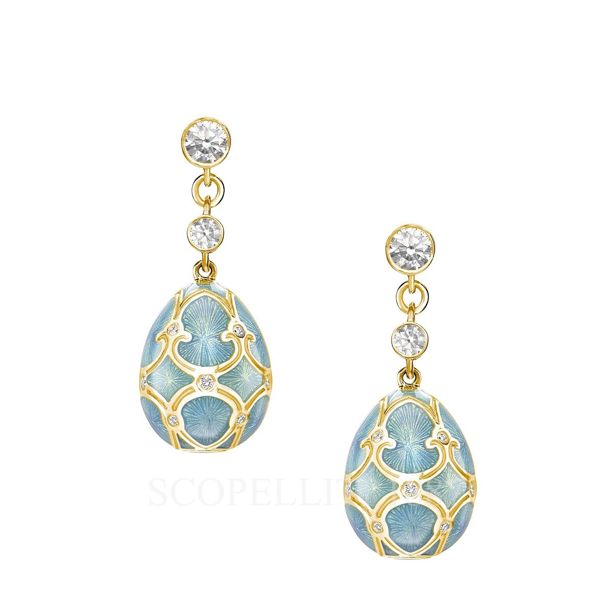 The Heritage Yellow Gold Diamond and Turquoise Guilloché Enamel Egg Drop Earrings feature turquoise guilloché enamel and round white diamonds, set in 18 karat yellow gold.