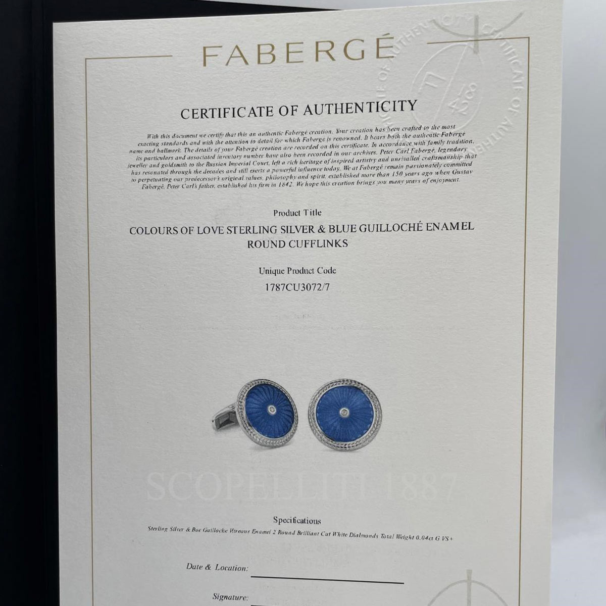 Fabergé Cufflinks in sterling silver with white diamond and blue enamel.
