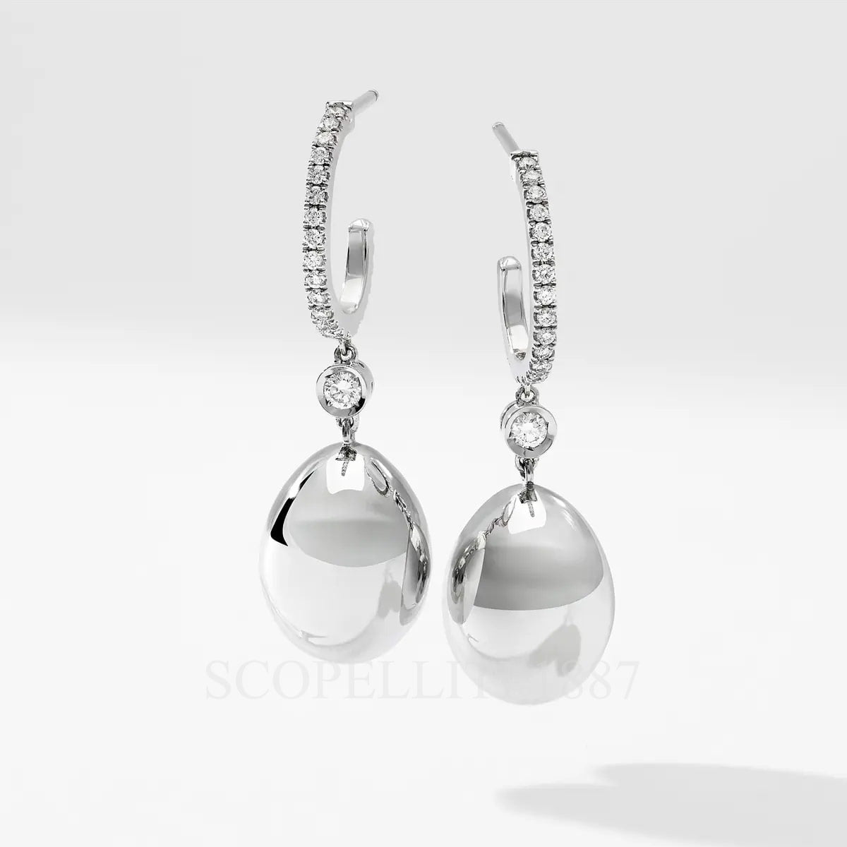 These Fabergé Essence White Gold Diamond Set Egg Drop Earrings features round white diamonds, set in 18 karat white gold. The eggs measure at 14mm. Features: 18kt white gold 44 round white diamonds = 0.37cts (F VS+)