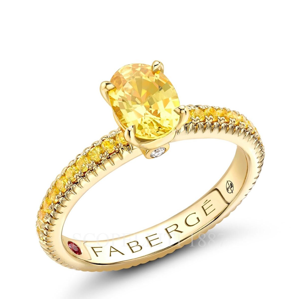 This Colours of Love Yellow Gold Yellow Sapphire Fluted Ring with Yellow Sapphire Shoulders features an oval 7×5 yellow sapphire centre gemstone, with yellow sapphire shoulders set in 18 karat fluted yellow gold. In keeping with its fondness for delight, surprise and discovery, Fabergé has concealed a Mozambican ruby on the inside of the band. The measurements for the shank are 2.7mm in width and 2mm in depth. Features: 18kt Yellow Gold 1 (7×5) Oval Yellow Sapphire Total Weight 0.88ct 22 Round Yellow Sapphires Total Weight 0.29ct 2 Round White Diamonds Total Weight 0.02ct 1 Round Mozambique Ruby Total Weight 0.02ct