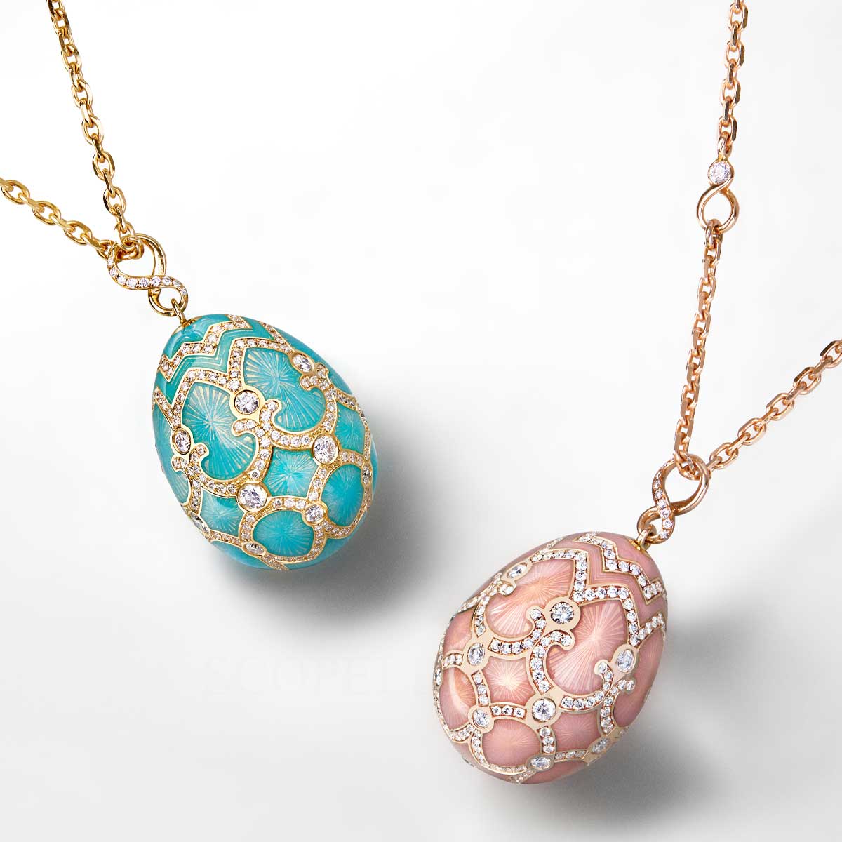 The Heritage Rose Gold Diamond and Pink Guilloché Enamel Grand Egg Pendant features pink guilloché enamel and round white diamonds, set in 18 karat rose gold. The Heritage collection recalls Fabergé’s most remarkable works. The Heritage draws inspiration from Fabergé’s historical masterpieces. Traditional materials and complex traditional techniques, such as the delicate art of guilloché enamelling and hand-engraving, make up the signature elements of this colourful and opulent collection. Fabergé Rose Gold Diamond Pink Grand Egg Pendant Heritage features: