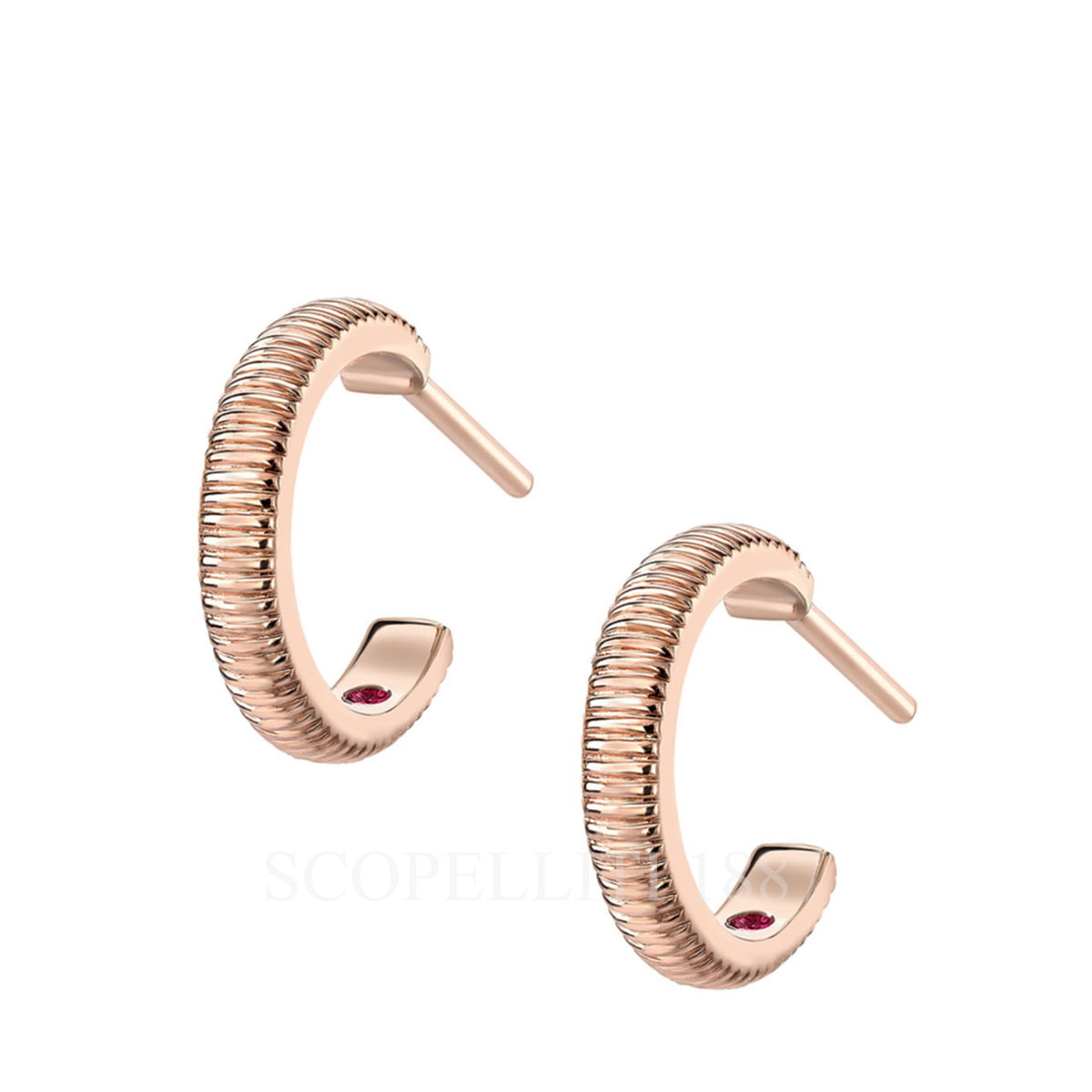 These Colours of Love Rose Gold Fluted Hoop Earrings are handmade in 18 karat rose gold and feature Mozambican rubies concealed on the inside. The earrings are 15mm in diameter. Features: 18kt rose gold 2 x round Mozambique ruby 0.04ct Total gross weight 4.92gms