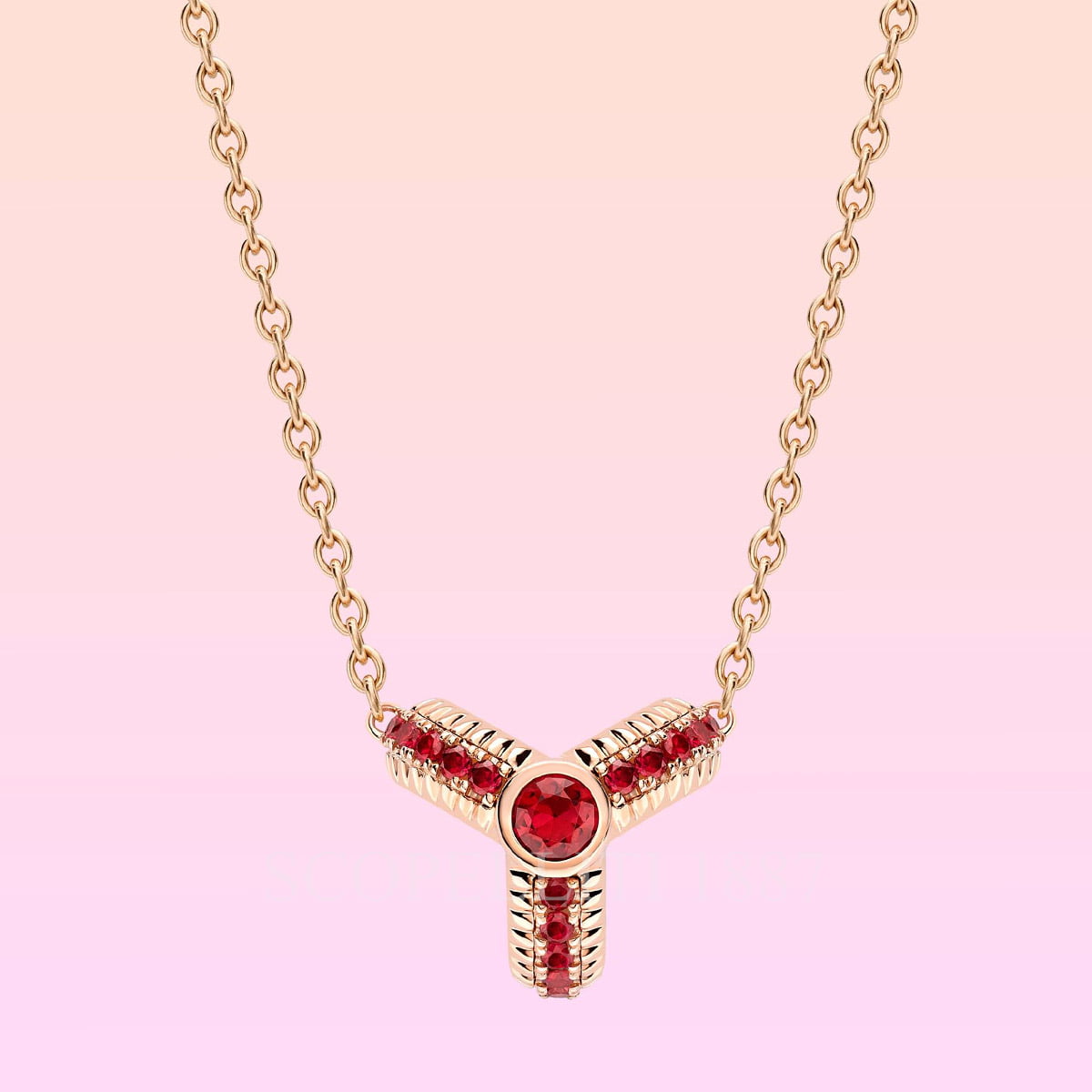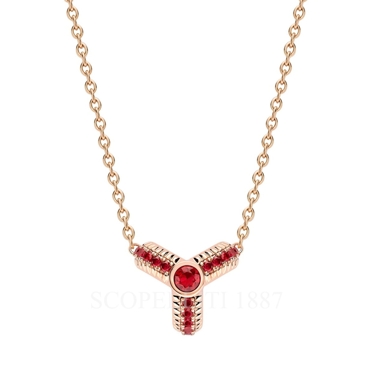 The Colours of Love Trio Rose Gold Ruby Fluted Pendant feature a round ruby at the centre surrounded by smaller pavé-set rubies set in 18kt fluted rose gold. In keeping with its fondness for delight, surprise and discovery, Fabergé has concealed a matching ruby on the inside of the pendant. The pendant is 10.5mm.