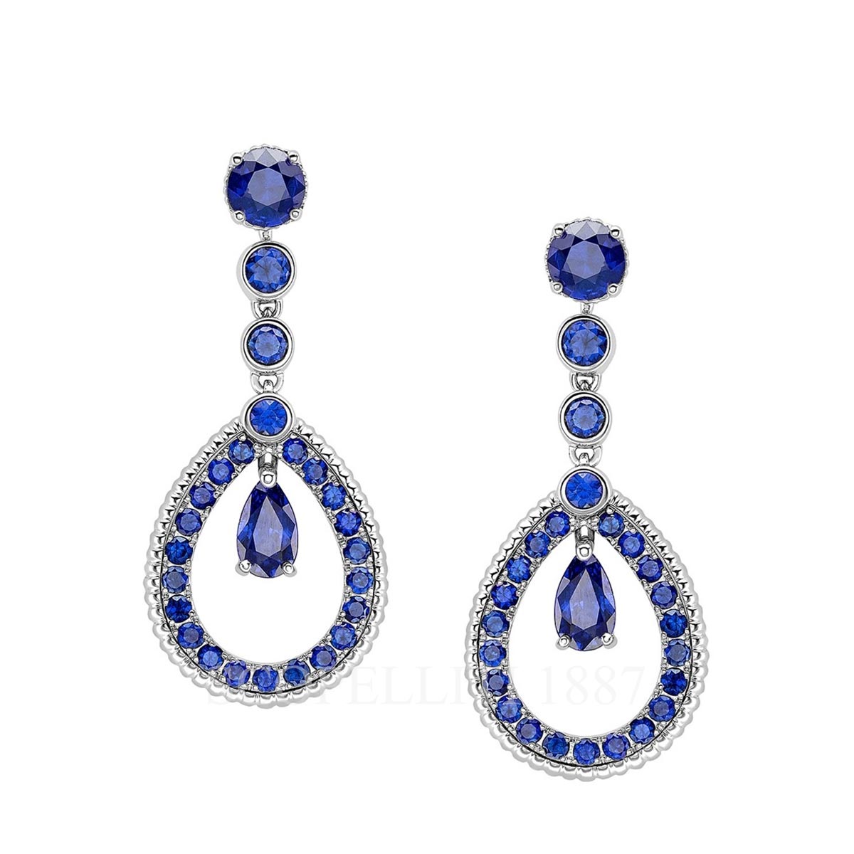 These exquisite Colours of Love White Gold Blue Sapphire Teardrop Earrings feature 52 round and 2 pear shaped blue sapphires beautifully set in 18 karat fluted white gold. The earrings are 27mm in length.