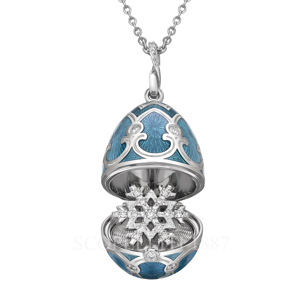 The Fabergé Heritage White Gold Diamond and Teal Guilloché Enamel Snowflake Surprise Locket features teal guilloché enamel and round white diamonds, set in 18 karat white gold. In keeping with its fondness for delight, surprise and discovery, Fabergé has concealed a snowflake decorated with white diamonds inside the locket. The locket is 22mm and comes with an 18 karat white gold chain. Fabergé White Gold Diamond Snowflake Surprise Locket Heritage features: