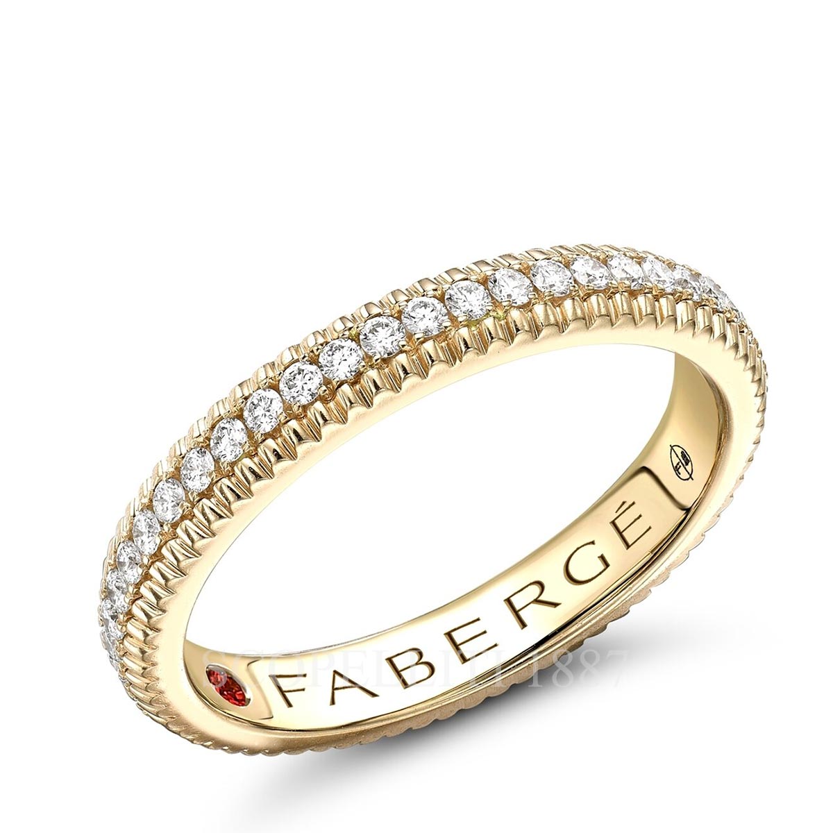 This Colours of Love Yellow Gold Diamond Fluted Eternity Ring features round white diamonds, set in 18 karat fluted yellow gold. In keeping with its fondness for delight, surprise and discovery, Fabergé has concealed a diamond on the inside of the band. The measurements for the shank are 2.7mm in width and 1.9mm in depth. Features: 18kt yellow gold 44 round white diamonds = 0.39cts (F VS+) 1 round ruby = 0.02cts (Mozambique)