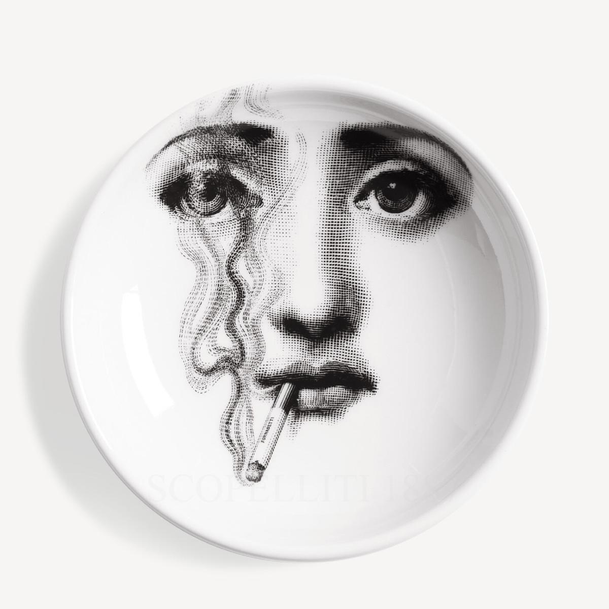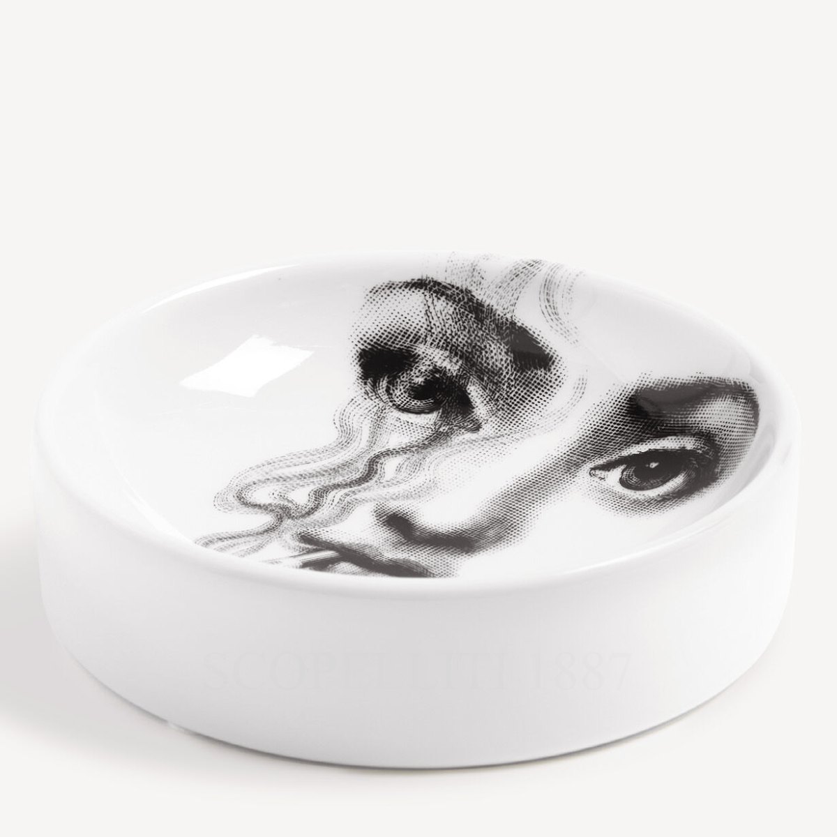 The Fornasetti Ashtray Tema e Variazioni n.81 features the face of opera singer Lina Cavalieri, a central motif in the brand’s renowned Tema e Variazioni collection. Hand-decorated in Italy, this porcelain round ashtray blends surreal wit and artistic expression, transforming a functional object into a luxury Italian porcelain decorative accent.