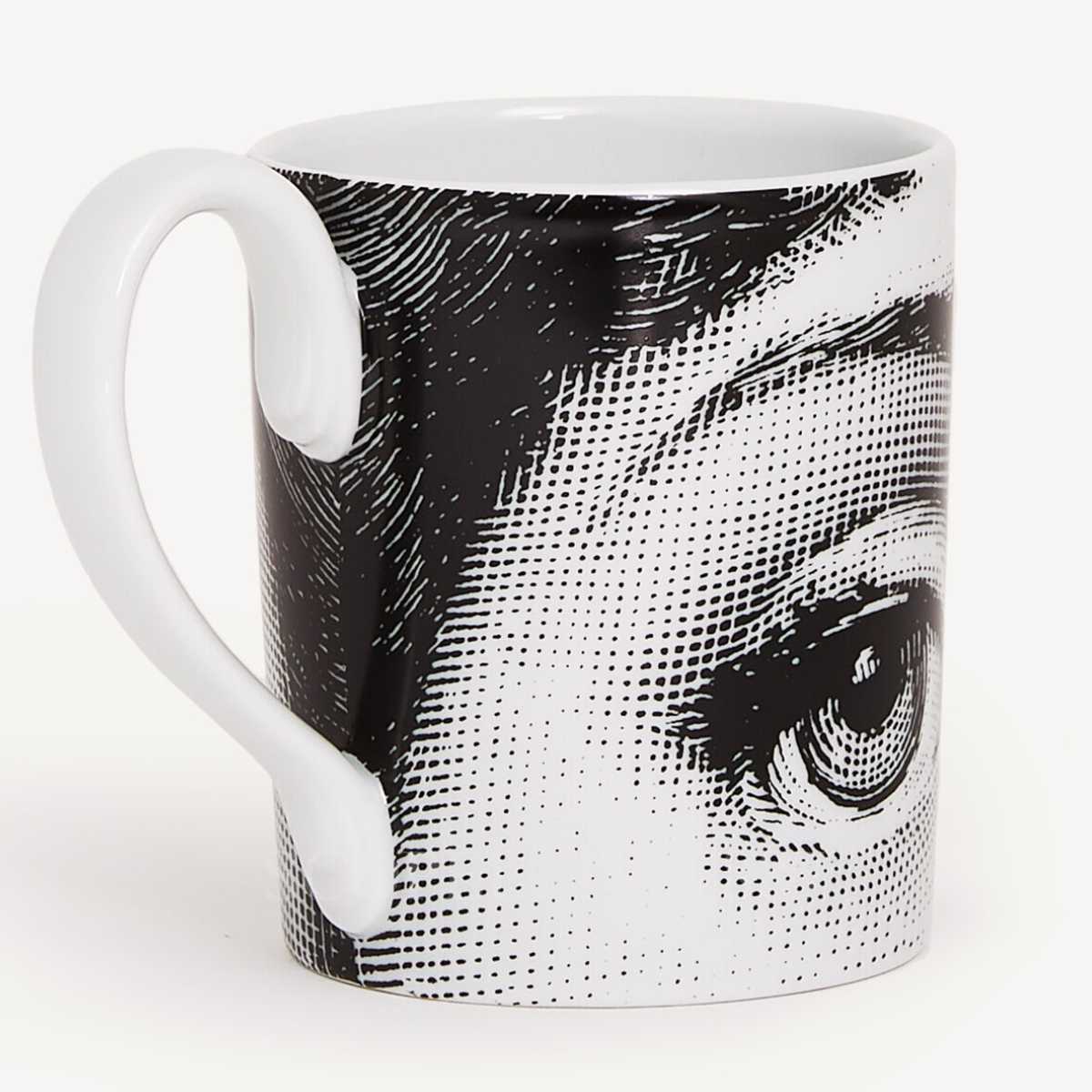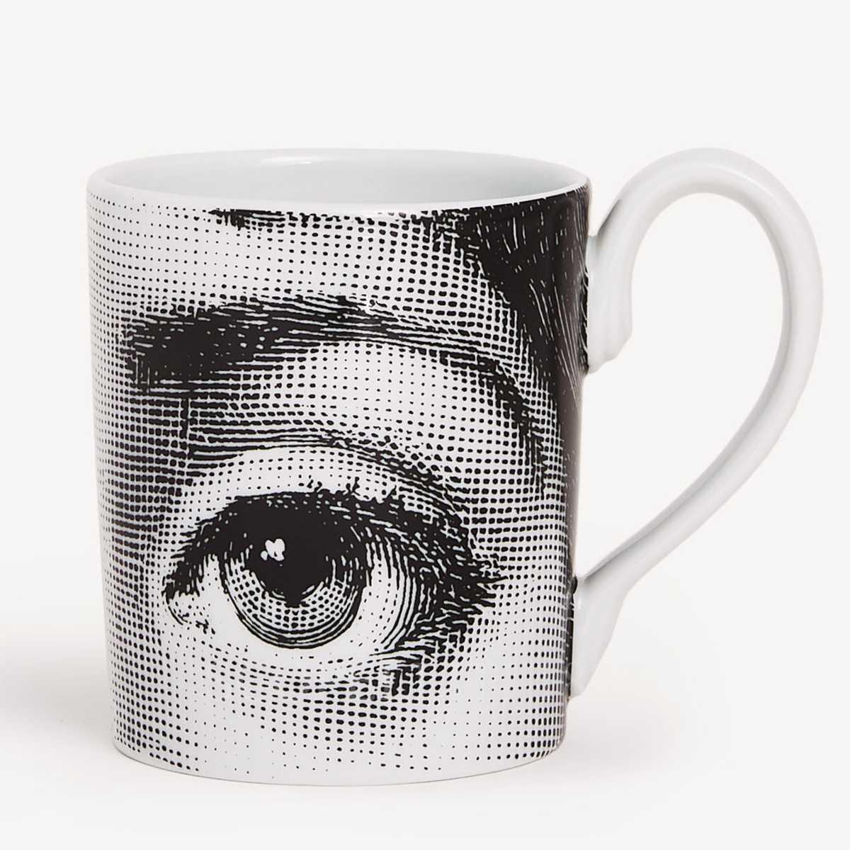 The Fornasetti Mug Occhi highlights the iconic eye of Lina Cavalieri, rendered in bold black-and-white on premium Italian porcelain. Part of the celebrated Tema e Variazioni collection, this mug brings an artistic focal point to kitchens, office desks, or curated coffee displays.